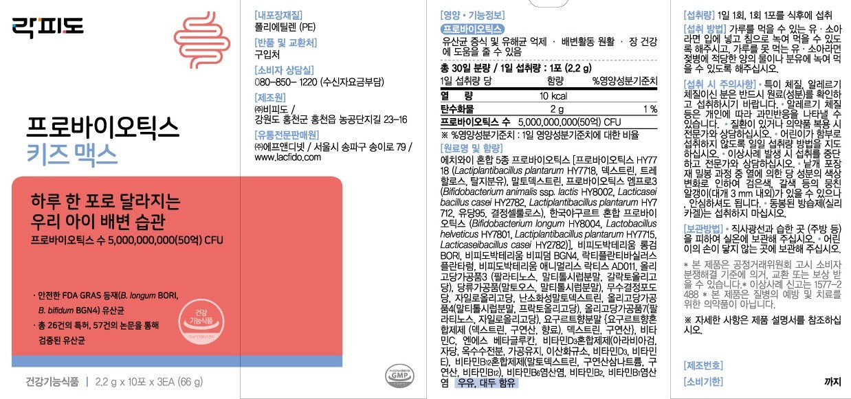 | 제품명 | 프로바이오틱스 키즈 맥스 | 제조업소의 명칭과 소재지 | 컨텐츠 참조 |
