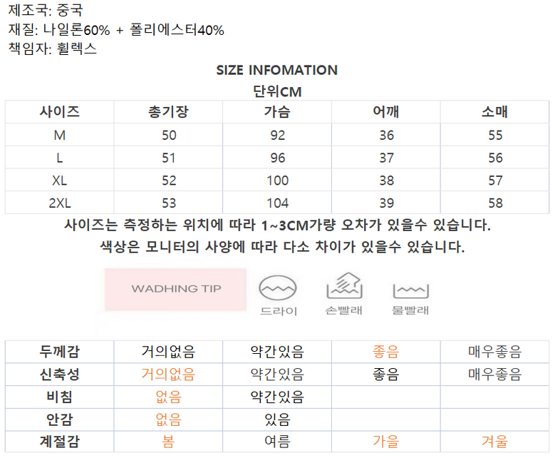 | 제조국 | 중국 | 세탁방법 및 취급시 주의사항 | 상품 상세페이지 참조 |