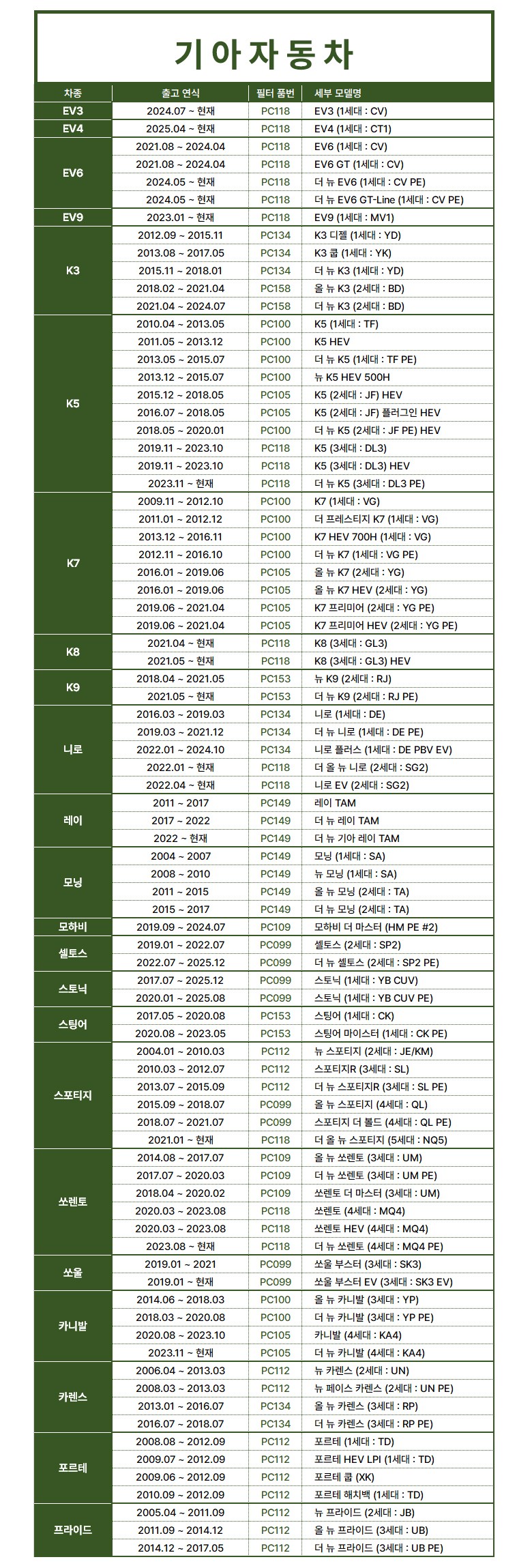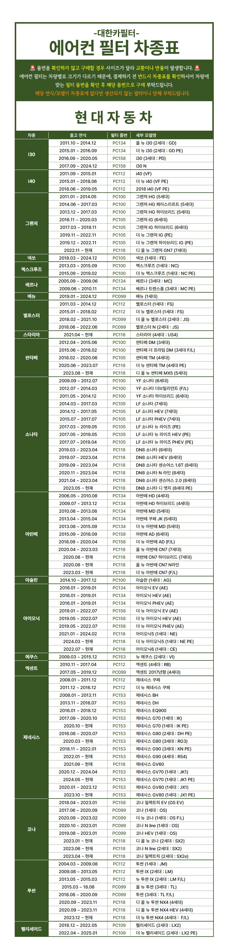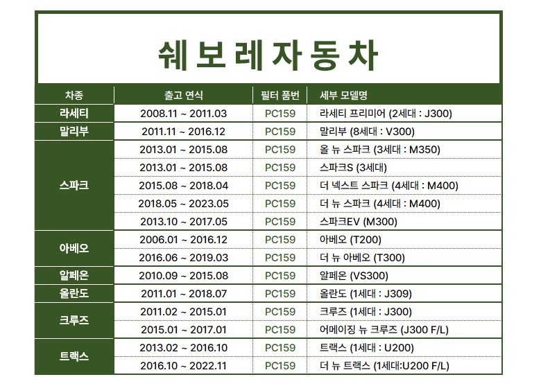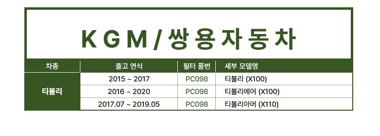| KC 인증정보(자동차관리법에 따른 자기인증 대상 자동차부품에 한함) | 해당없음 | 제조자(수입자) | 대한카필터 |