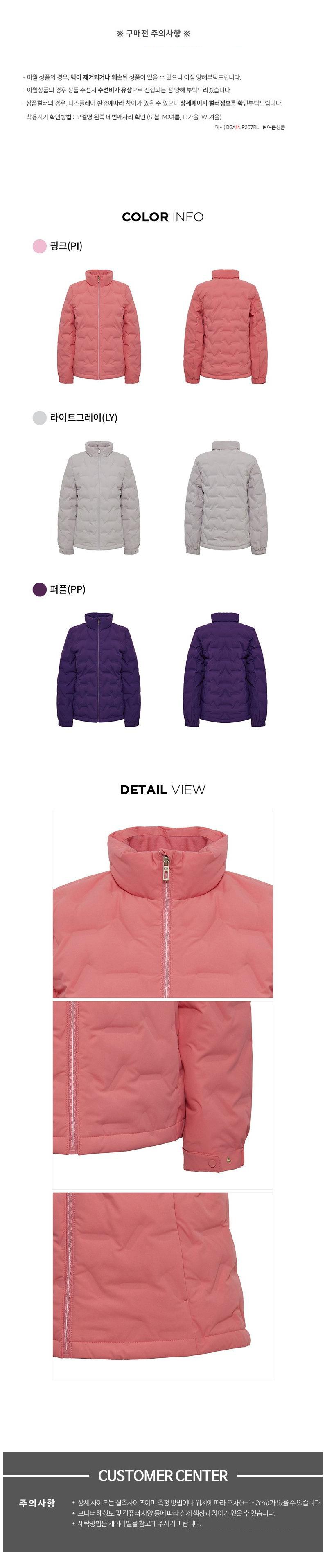 | 제품 소재 | 겉감: 폴리에스터100% / 안감: 나일론100% / 배색: 폴리에스터100% / 충전재: 솜털80%, 깃털20% | 색상 | 퍼플(PP) |