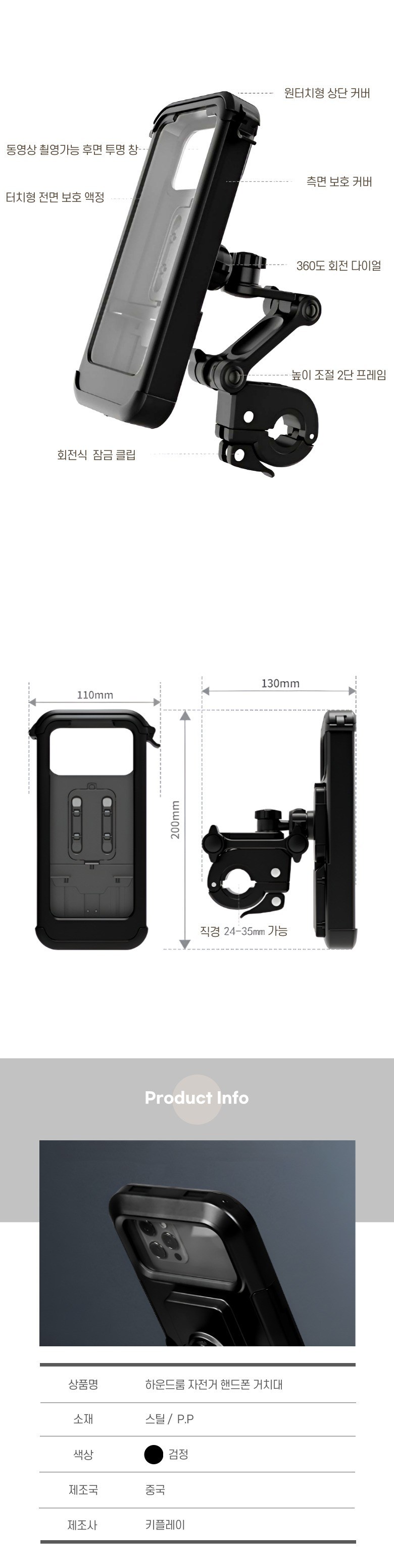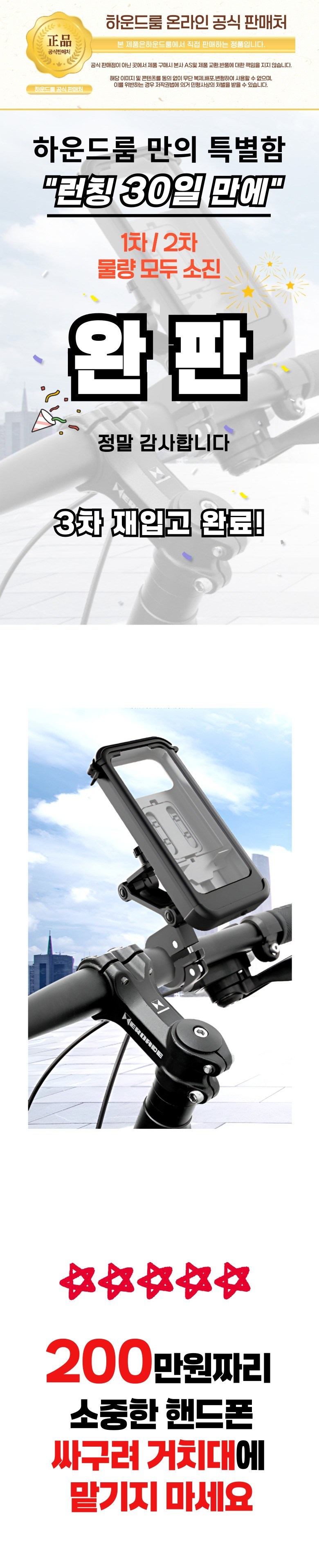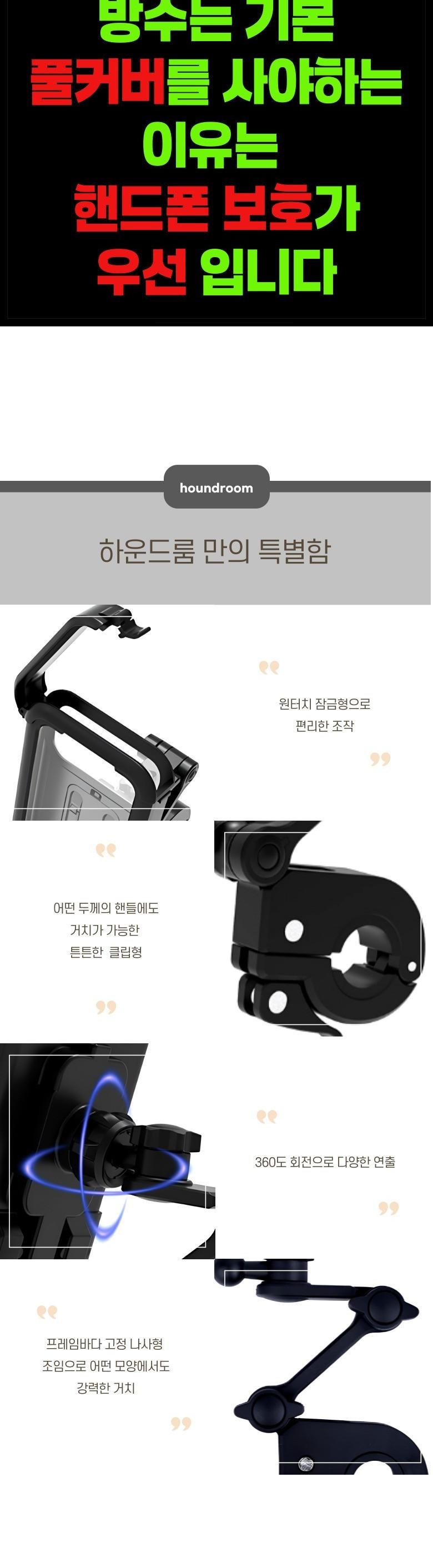 | 품명 및 모델명 | 하운드룸 흔들림없는 튼튼한 방수 자전거 핸드폰 거치대 | 인증/허가 사항 | 해당없음 |