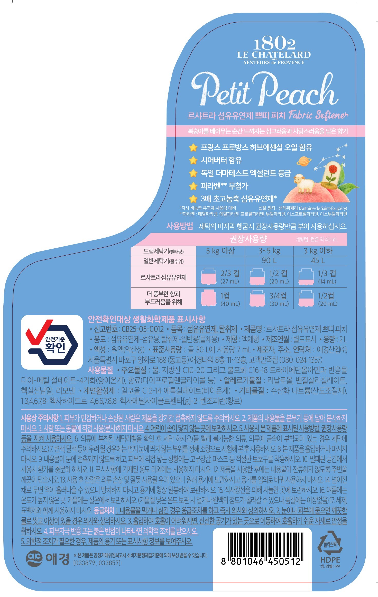 | 품목 및 제품명 | 섬유유연제, 탈취제 / 르샤트라 섬유유연제 쁘띠 피치 | 용도(표백제의 경우 계열을 함께표시) 및 제형 | 섬유유연제-섬유용, 탈취제-일반용(물체용) / 액체형 |