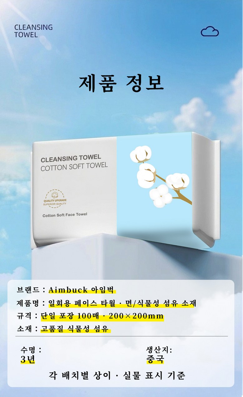 | 품명 및 모델명 | Aimbuck 100% 천연 순면 일회용 페이스타올 200x200mm | 인증/허가 사항 | 상품 상세페이지 참조 |
