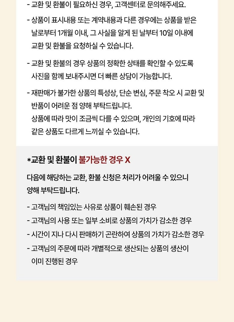 | 계절상품/식품/화장품 | ㆍ신선/냉장/냉동 상품의 단순변심의 경우 ㆍ뷰티 상품 이용 시 트러블(알러지, 붉은 반점, 가려움, 따가움)이 발생하는 경우, |