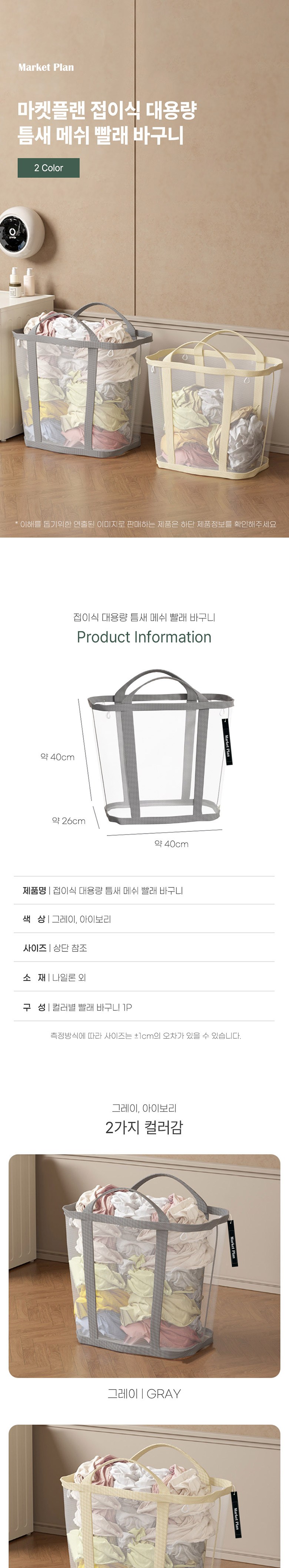 | 품명 및 모델명 | 마켓플랜 접이식 대용량 틈새 메쉬 빨래 바구니 | 인증/허가 사항 | 해당없음 |