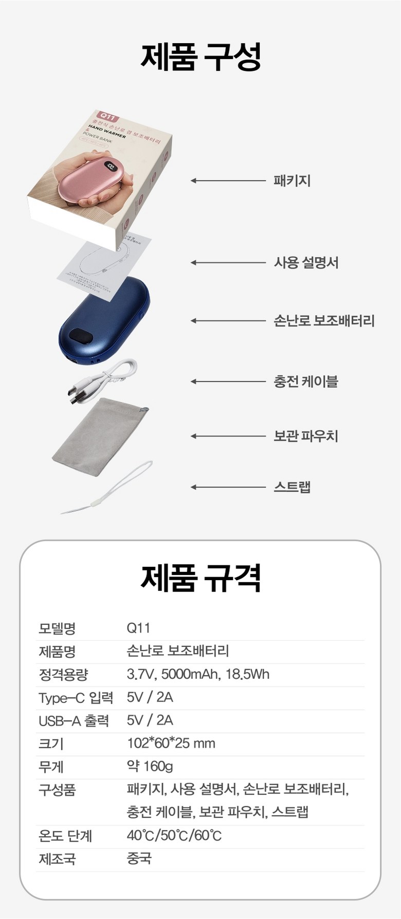 | 품명 및 모델명 | 손난로 보조배터리 Q11 | KC 인증정보 | XU101030-19014A |