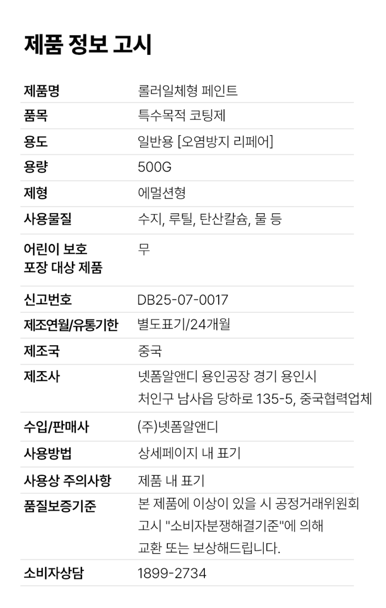 | 소비자상담 및 교환반품 문의 | 쿠팡고객센터 1577-7011 배송 및 환불/교환에 대한 문의는 마이쿠팡-고객센터 내 상담하기를 이용해주세요. | ||