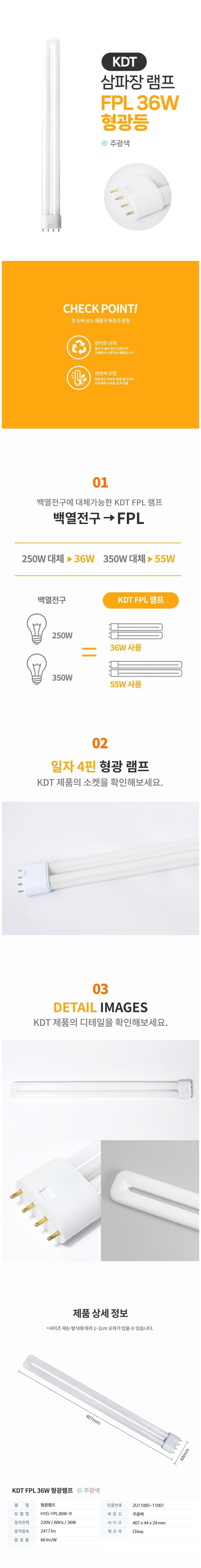 | 품명 및 모델명 | 형광램프 / HYG-FPL36W-R | KC 인증정보 | ZU11005-11001 | 최저소비효율기준 만족 |