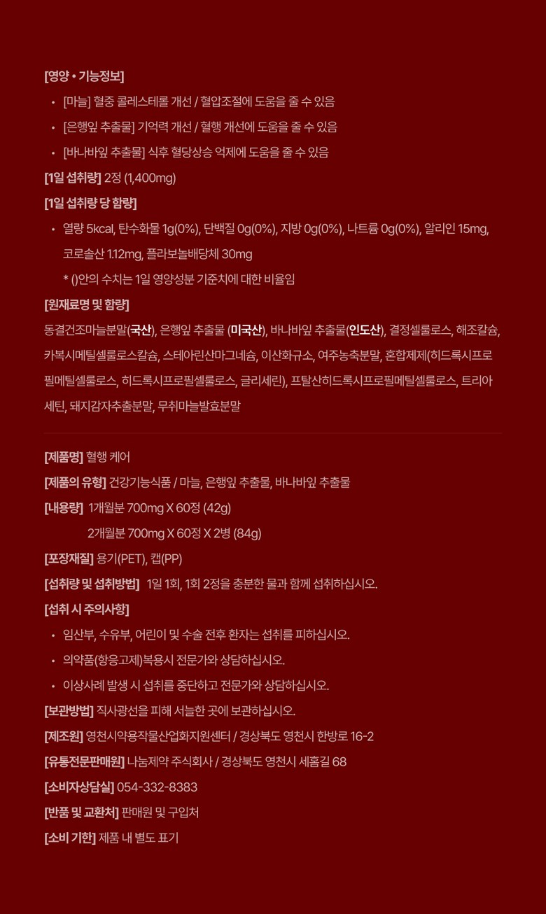 | 제품명 | 혈행케어 | 제조업소의 명칭과 소재지 | 영천시약용작물산업화지원센터 / 경상북도 영천시 한방로 16-2 |
