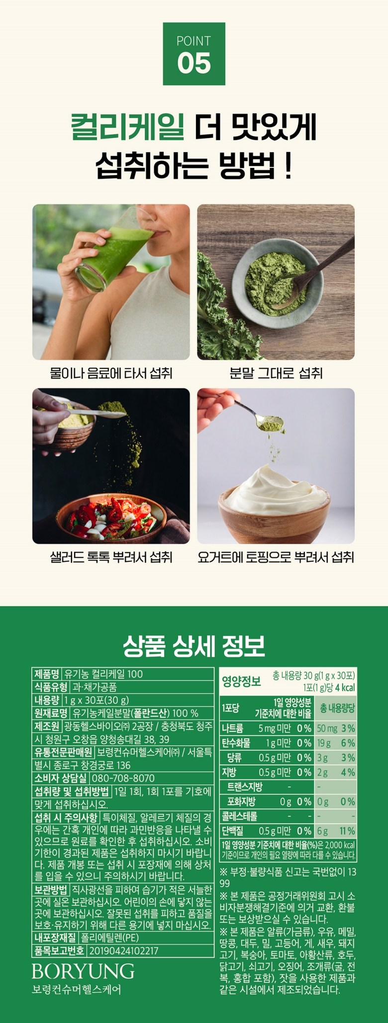 | 포장단위별 내용물의 용량(중량), 수량 | 1g x 30포 | 원재료명 및 함량 | 유기농케일분말(폴란드산) 100% |