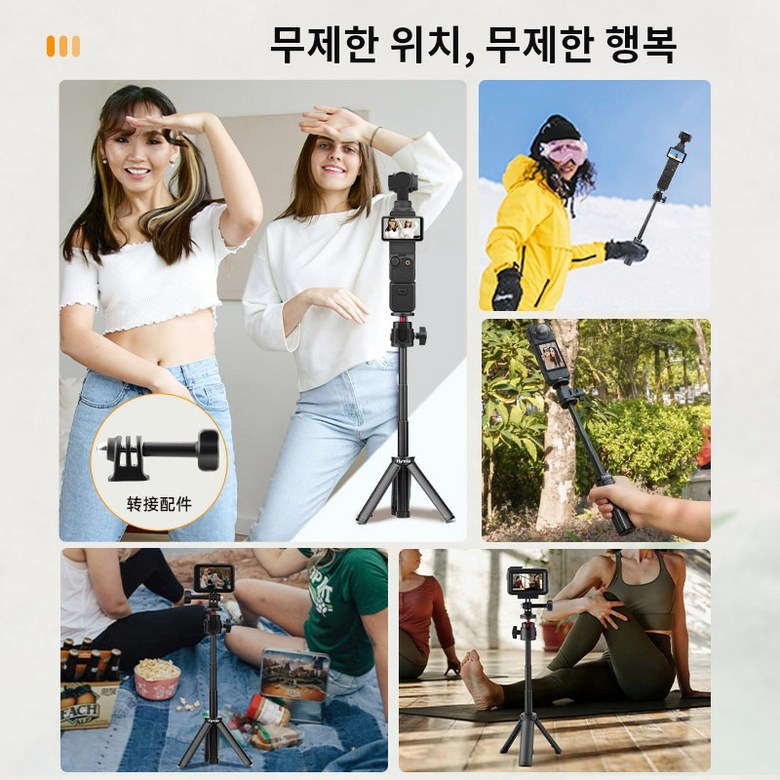 폭넓은 호환성: 표준 나사 마운트를 사용하는 고프로, DJI 오스모 액션, 인스타360, DJI 포켓 시리즈 등 다양한 액션 캠라와 호환됩니다.