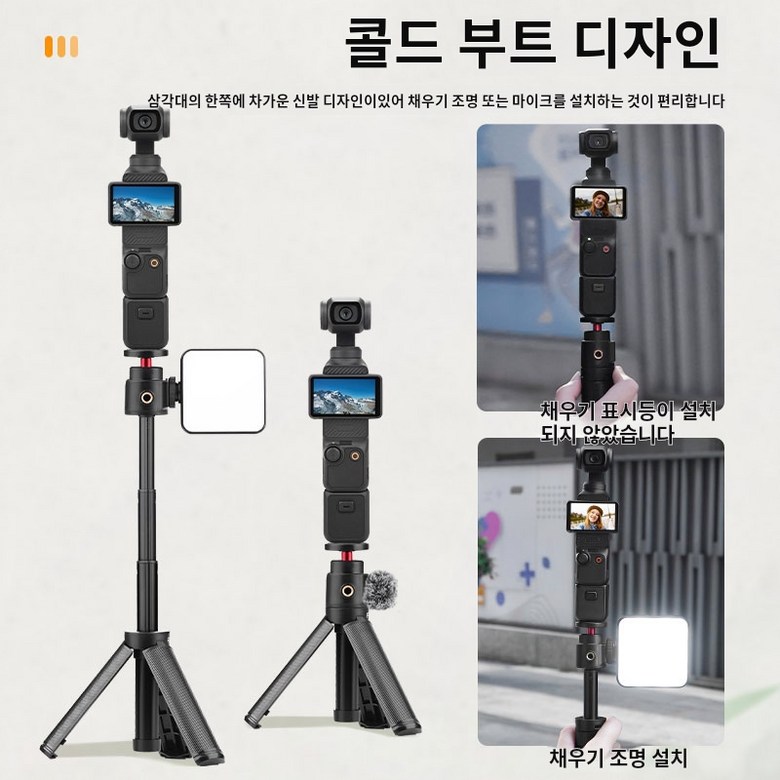 편리한 확장성: 삼각架 측면에 장착된 콜드슈 포트를利用해 LED 동영상 조명이나 외부 마이크 등의 액세서리를 추가로 설치할 수 있어 촬영 퀄리티를 높일 수 있습니다.