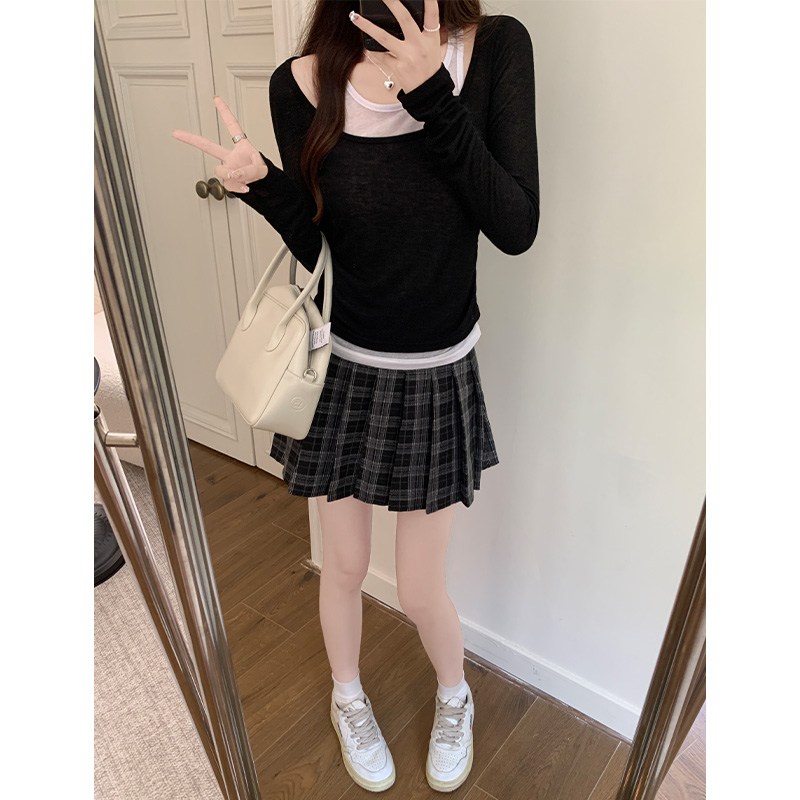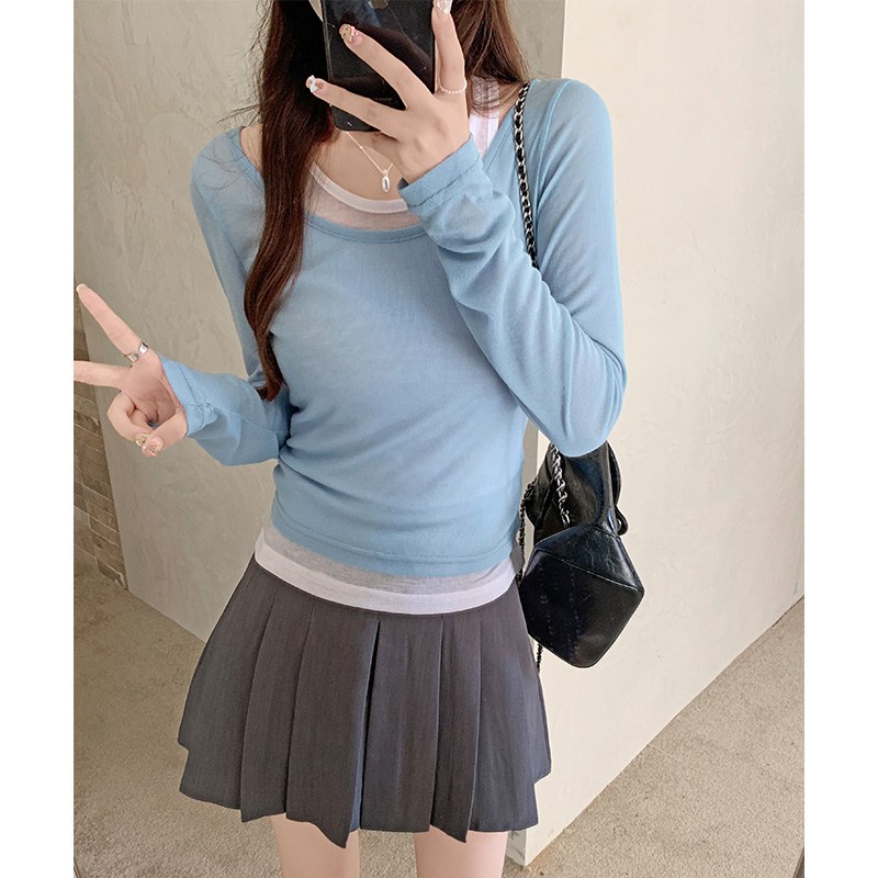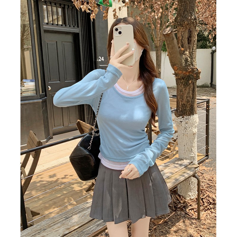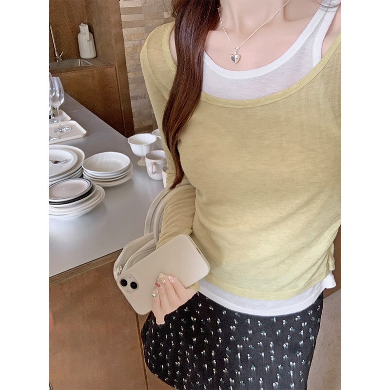 SHENGBIN 여성 스트릿 배색 레이어드 슬림핏 크롭 긴팔 티셔츠