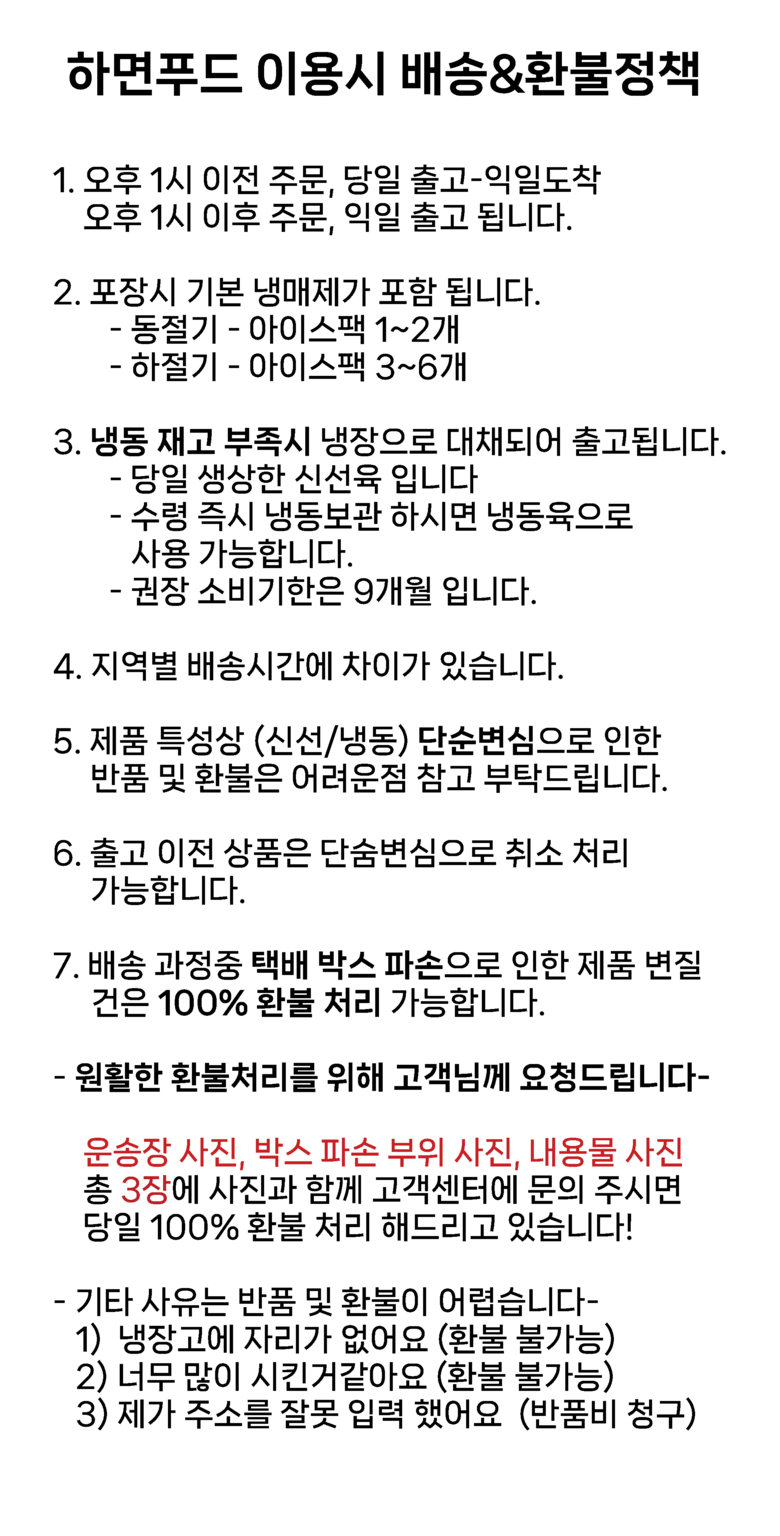 | 배송방법 | 신선/냉장/냉동 | 배송비 | 무료배송 - 도서산간 지역 배송불가 |