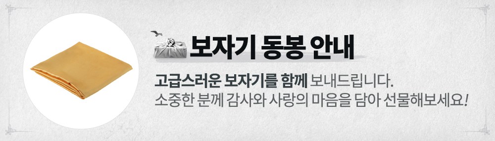 부직포 가방에 정갈하게 포장한 후, 보자기를 동봉하여 보내 드립니다. 소중한 분께 감사와 사랑의 마음을 담아 선물해보세요.