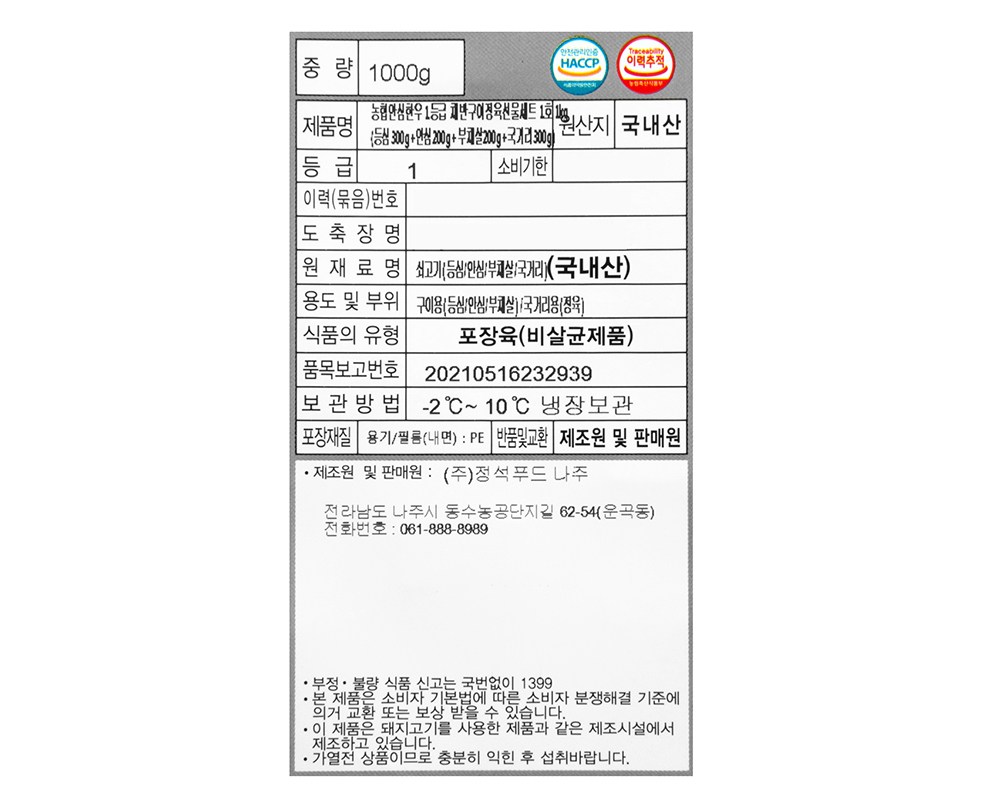 | 제조연월일, 소비기한 또는 품질유지기한 | 업데이트 예정 | 세부 품목군별 표시사항 | 축산물 등급표시 : 1등급 / 이력번호 표시유무 : 이력번호 표시제품임 |