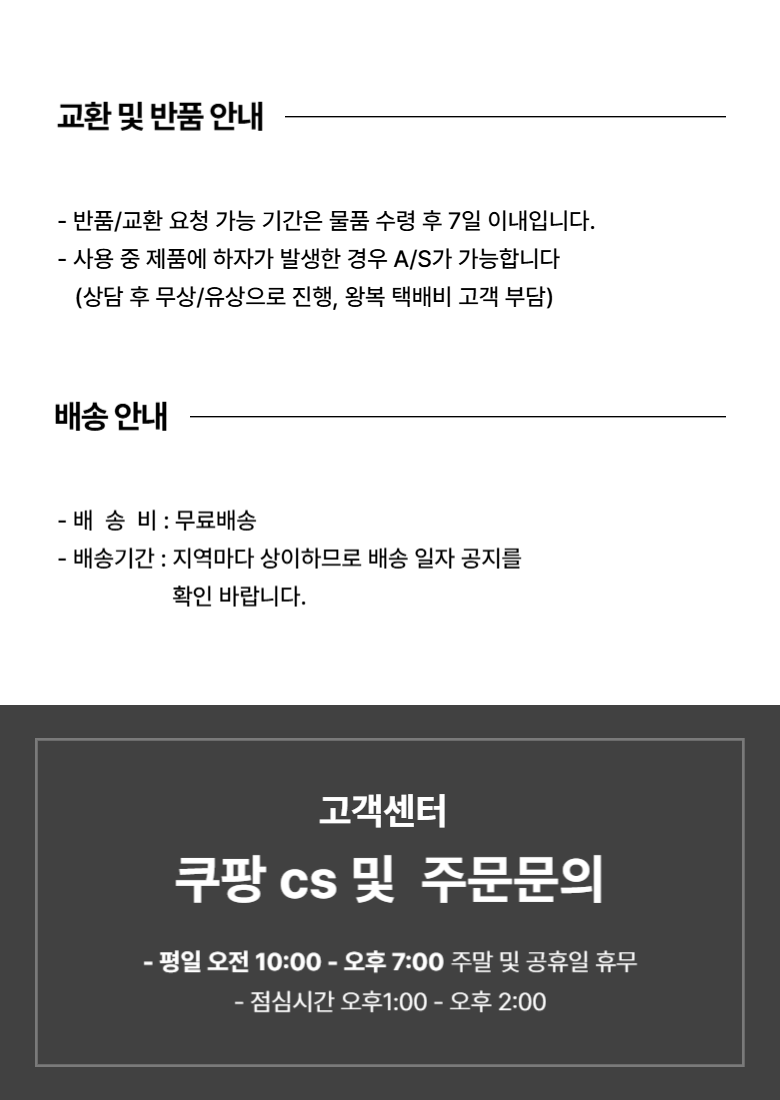| 소비자상담 및 교환반품 문의 | 쿠팡고객센터 1577-7011 배송 및 환불/교환에 대한 문의는 마이쿠팡-고객센터 내 상담하기를 이용해주세요. | ||