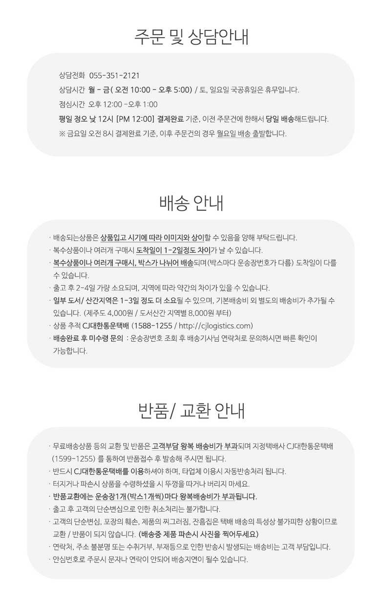 | 교환/반품 비용 (왕복비용) | 8,000원 - 단, 고객 변심의 경우에만 발생 - 도서산간 지역 배송불가 |