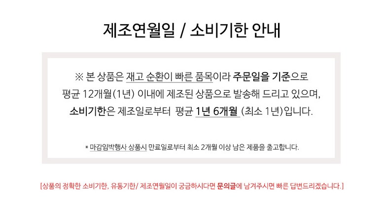 | 생산자 및 소재지 | 상품 상세페이지 참조 | 제조연월일, 소비기한 또는 품질유지기한 | 상품 상세페이지 참조 |