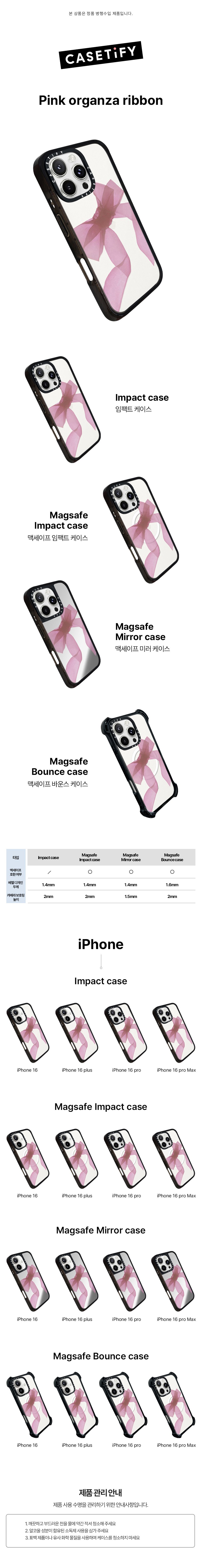 | 품명 및 모델명 | Casetify pink organza ribbon Impact case iPhone 16 | 인증/허가 사항 | 해당없음(14세 이상) |