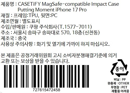 | 품명 및 모델명 | 케이스티파이 MagSafe Compatible Impact 휴대폰 케이스, Putting Moment, 아이폰 17 Pro | 인증/허가 사항 | 해당없음(14세 이상) |