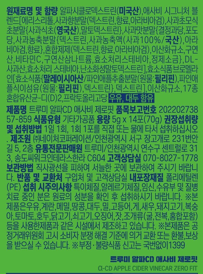| 포장단위별 내용물의 용량(중량), 수량 | 14회분 x 5개 | 원재료명 및 함량 | 컨텐츠 참조 |