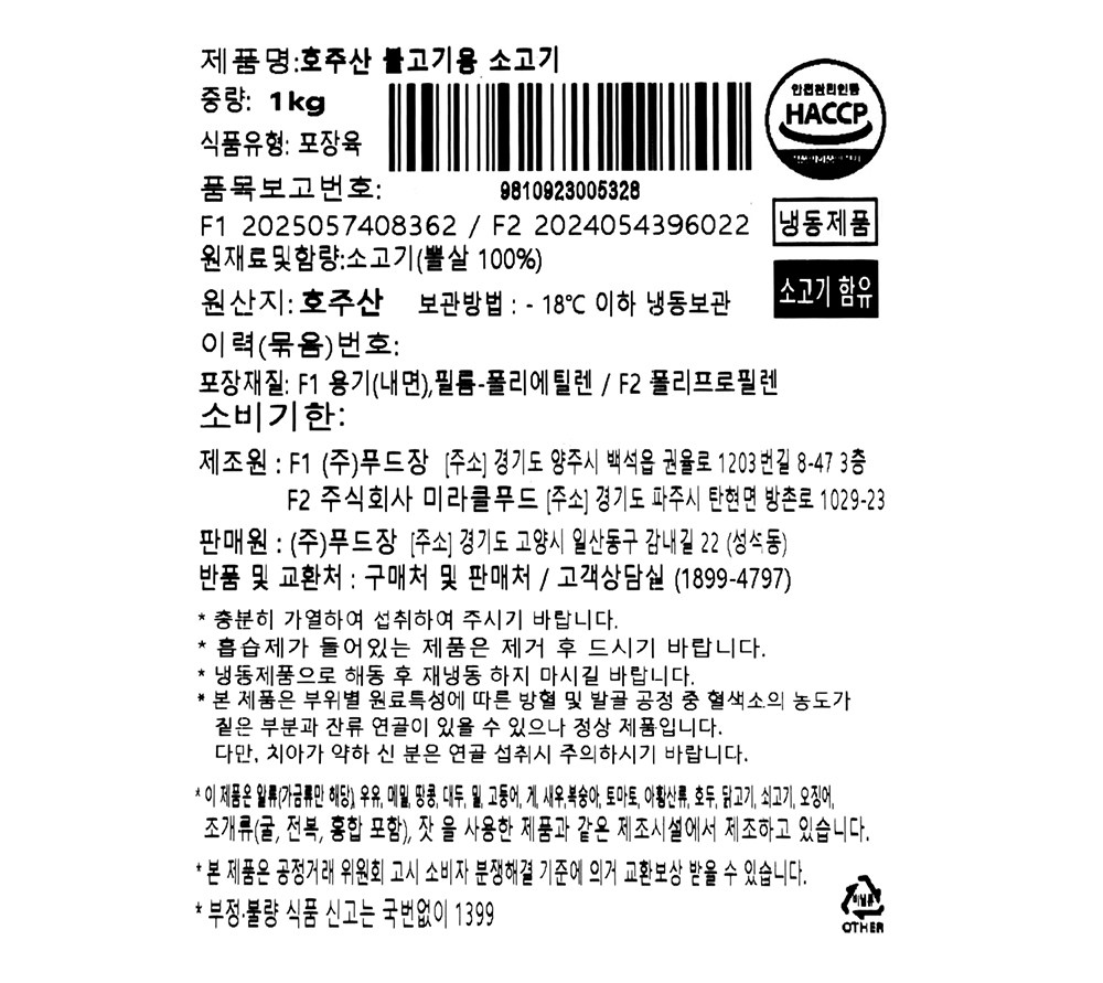 | 제조연월일, 소비기한 또는 품질유지기한 | 소비기한(또는 유통기한) : 2026년 12월 09일 이거나 그 이후인 상품 제조년월일 : 2025년 12월 10일 이후인 제조상품 | 세부 품목군별 표시사항 | 축산물 등급표시 : 해당 없음 / 이력번호 표시유무 : 이력번호 표시제품임 |