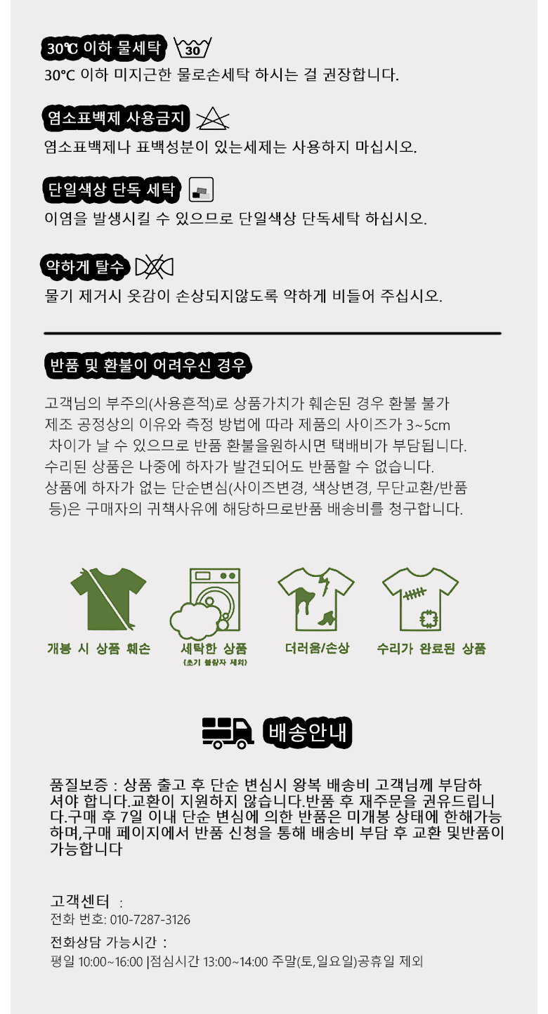 - ㆍ모니터 해상도의 차이로 인해 색상이나 이미지가 실제와 달라, 고객이 단순 변심으로 교환/반품을 무료로 요청하는 경우
