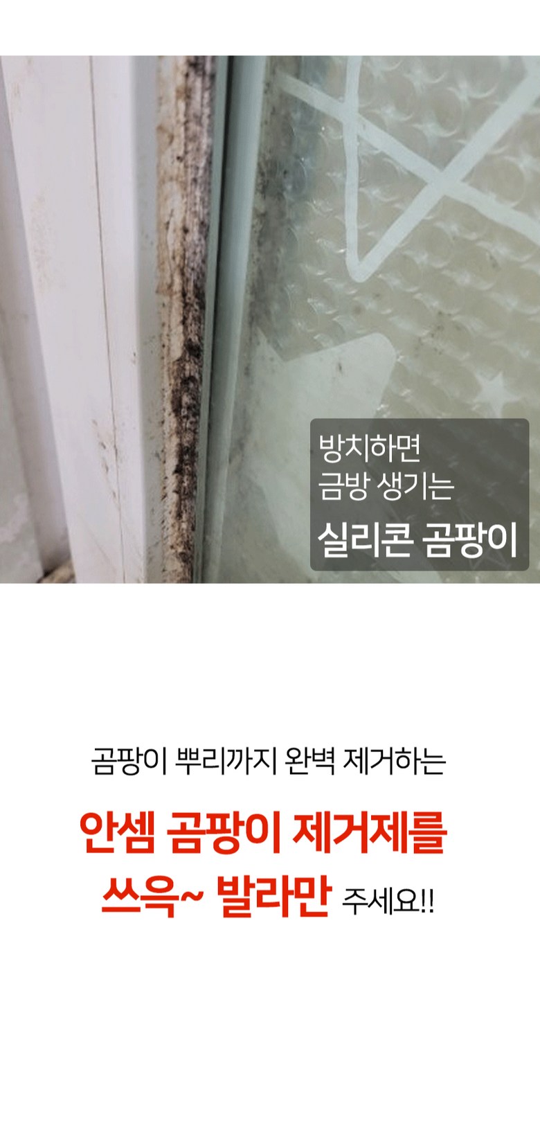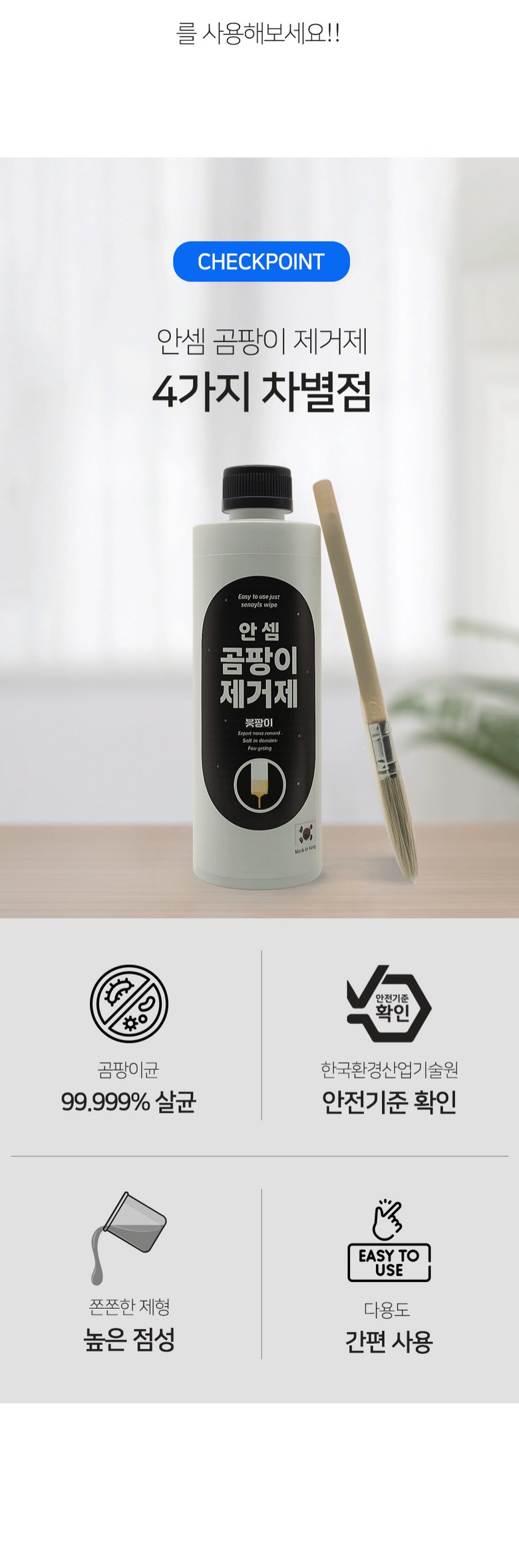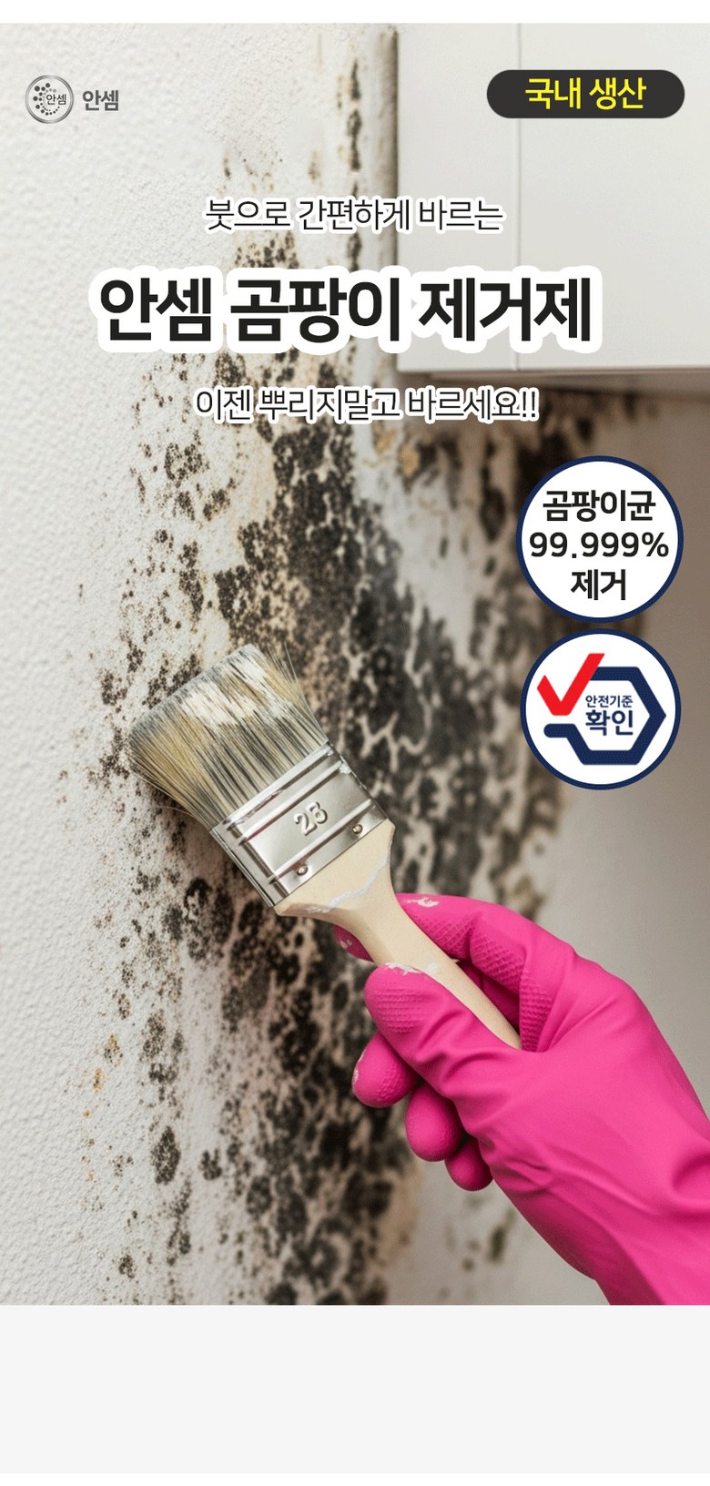 | 품목 및 제품명 | 안셈 곰팡이 제거제 붓팡이 | 용도(표백제의 경우 계열을 함께표시) 및 제형 | 세정제 - 일반용 (기타표면(벽지,실리콘,베란다)일반용(가구용)(건물바닥용)(변기용)(욕실용)살균제-일반용(곰팡이제거용),(일반물체용) |