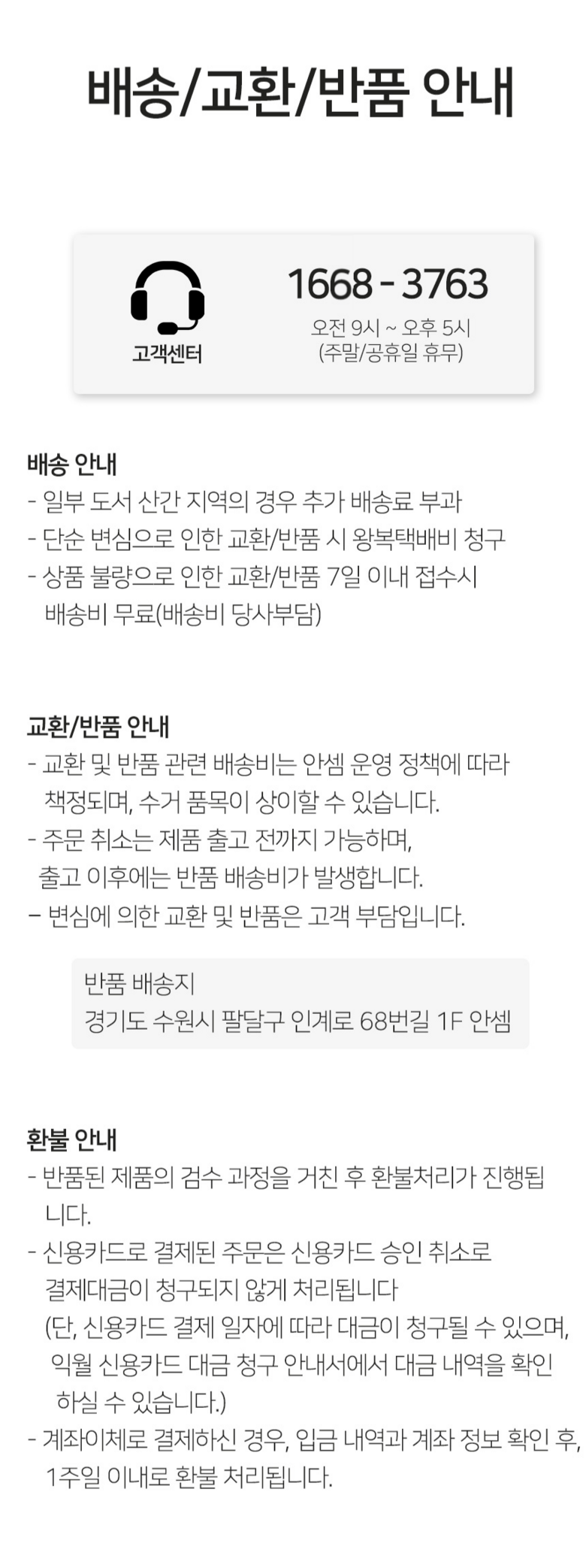 - ㆍ모니터 해상도의 차이로 인해 색상이나 이미지가 실제와 달라, 고객이 단순 변심으로 교환/반품을 무료로 요청하는 경우