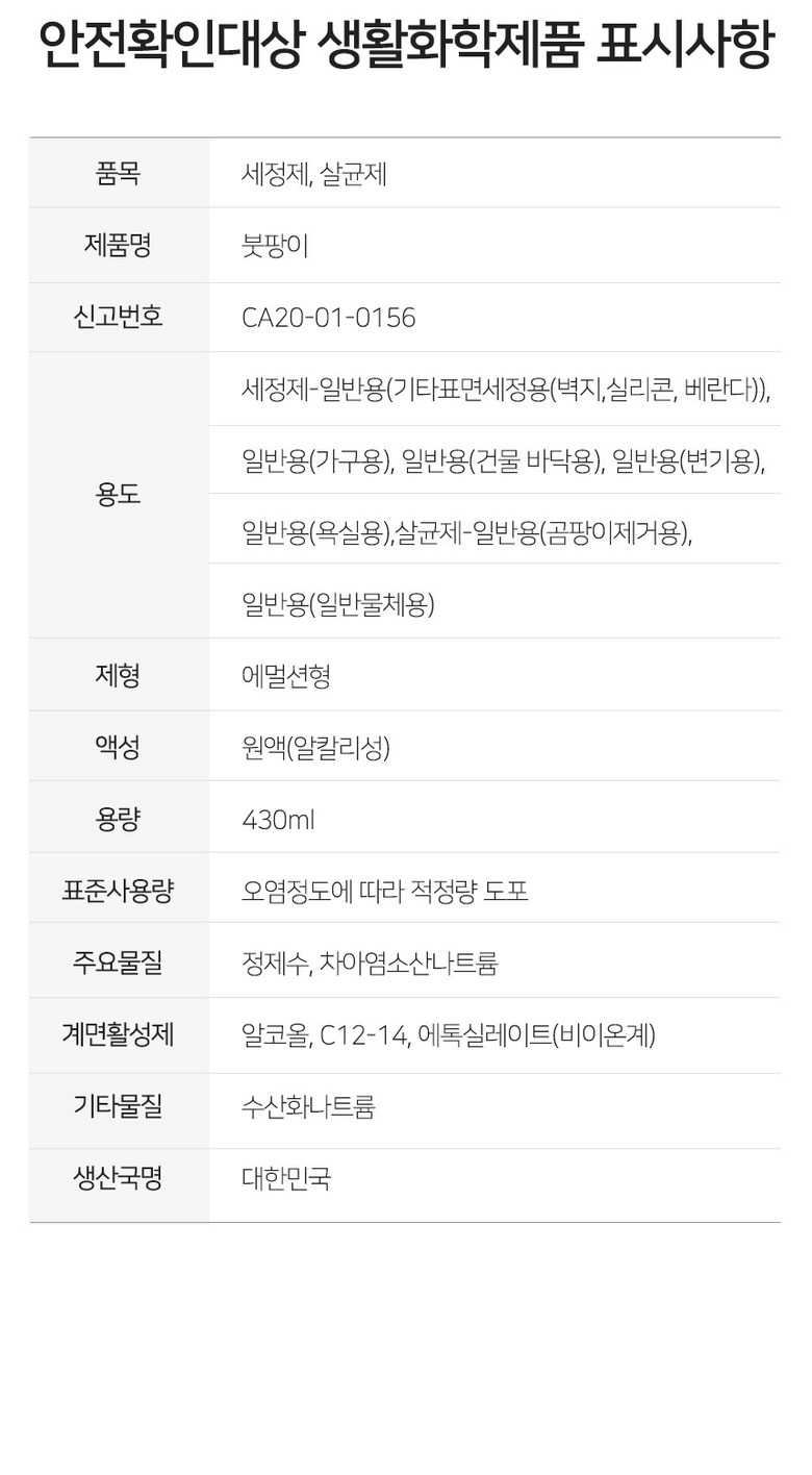 | 효과,효능 (승인대상 제품에 한함) | 곰팡이제거 세정제,살균제 | 수입자(수입제품에 한함), 제조국 및 제조사 | 대한민국 |