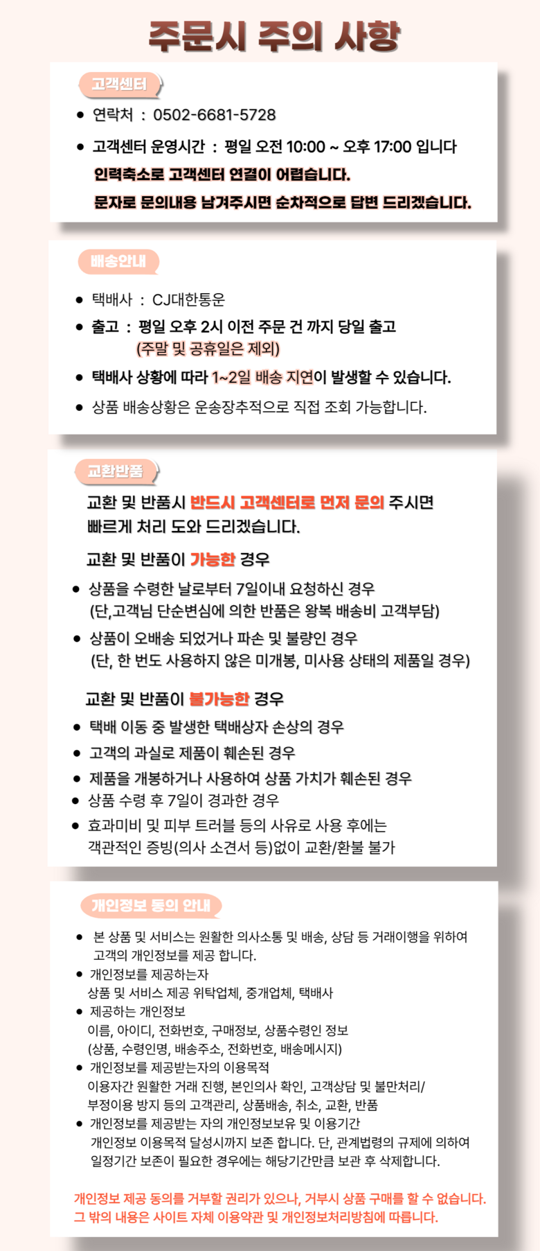 | 배송방법 | 순차배송 | 배송비 | 무료배송 - 도서산간 지역 배송불가 |