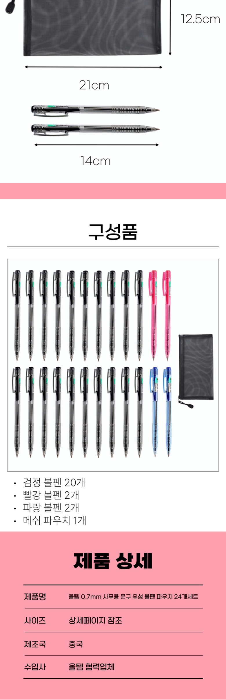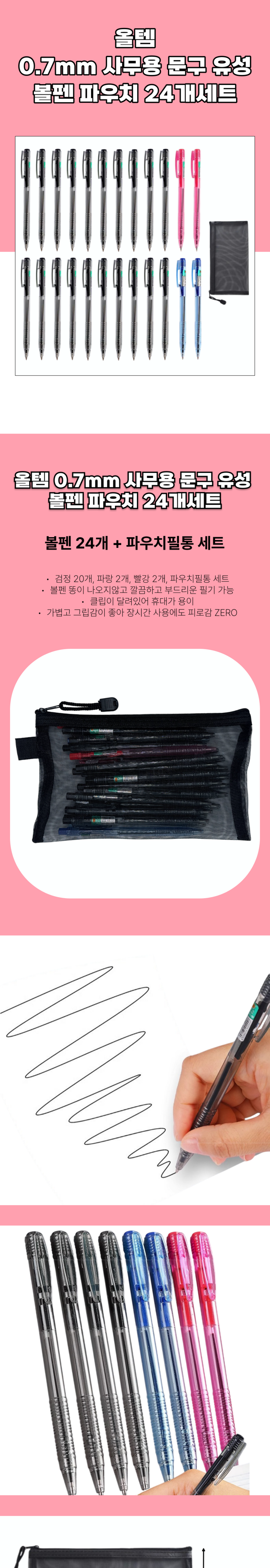 올템 0.7mm 사무용 문구 유성 볼펜 파우치 24개세트