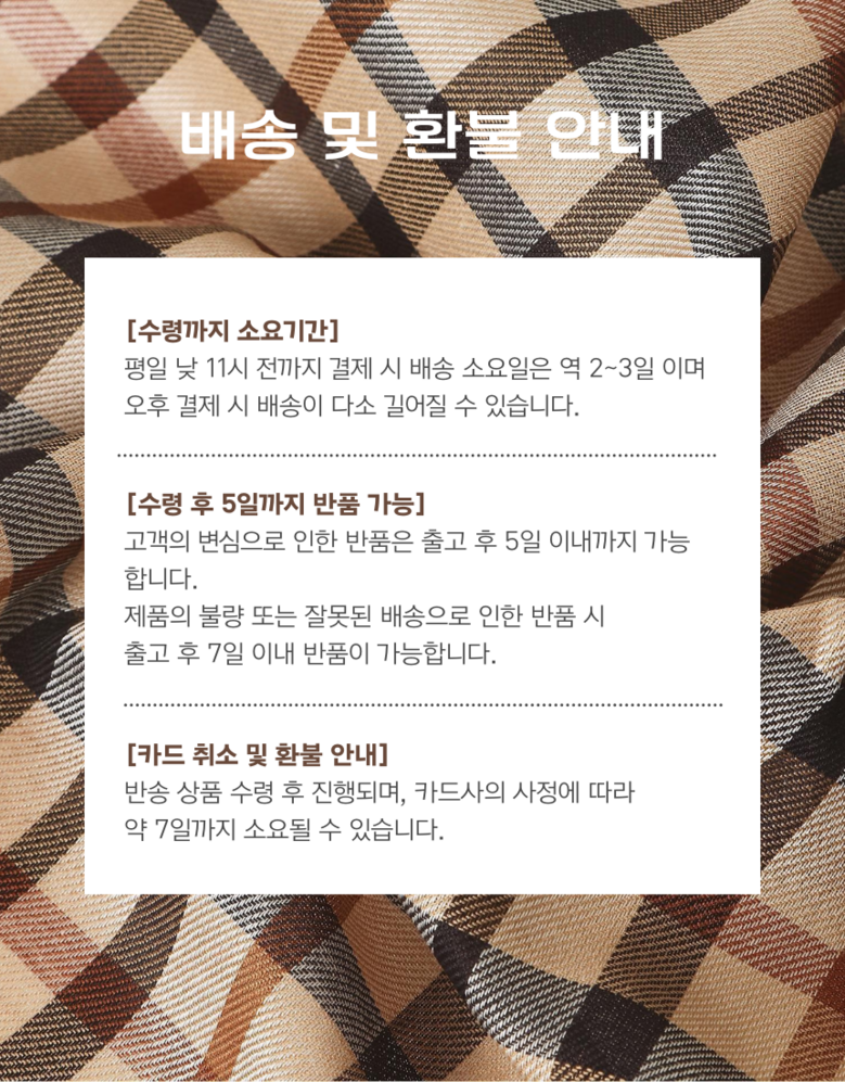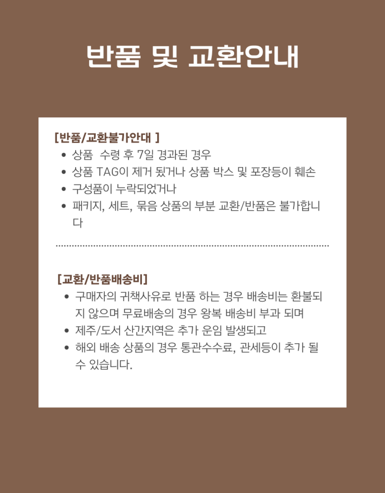 - ㆍ모니터 해상도의 차이로 인해 색상이나 이미지가 실제와 달라, 고객이 단순 변심으로 교환/반품을 무료로 요청하는 경우
