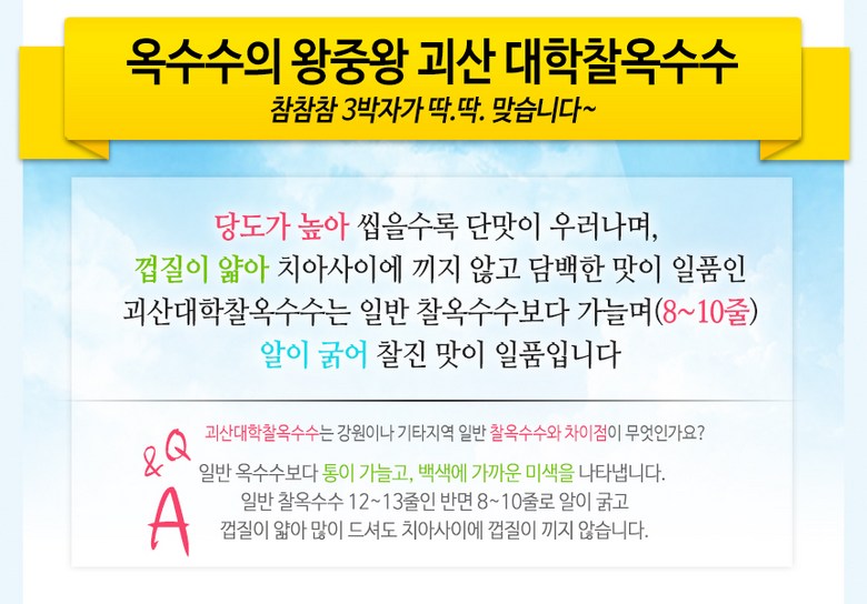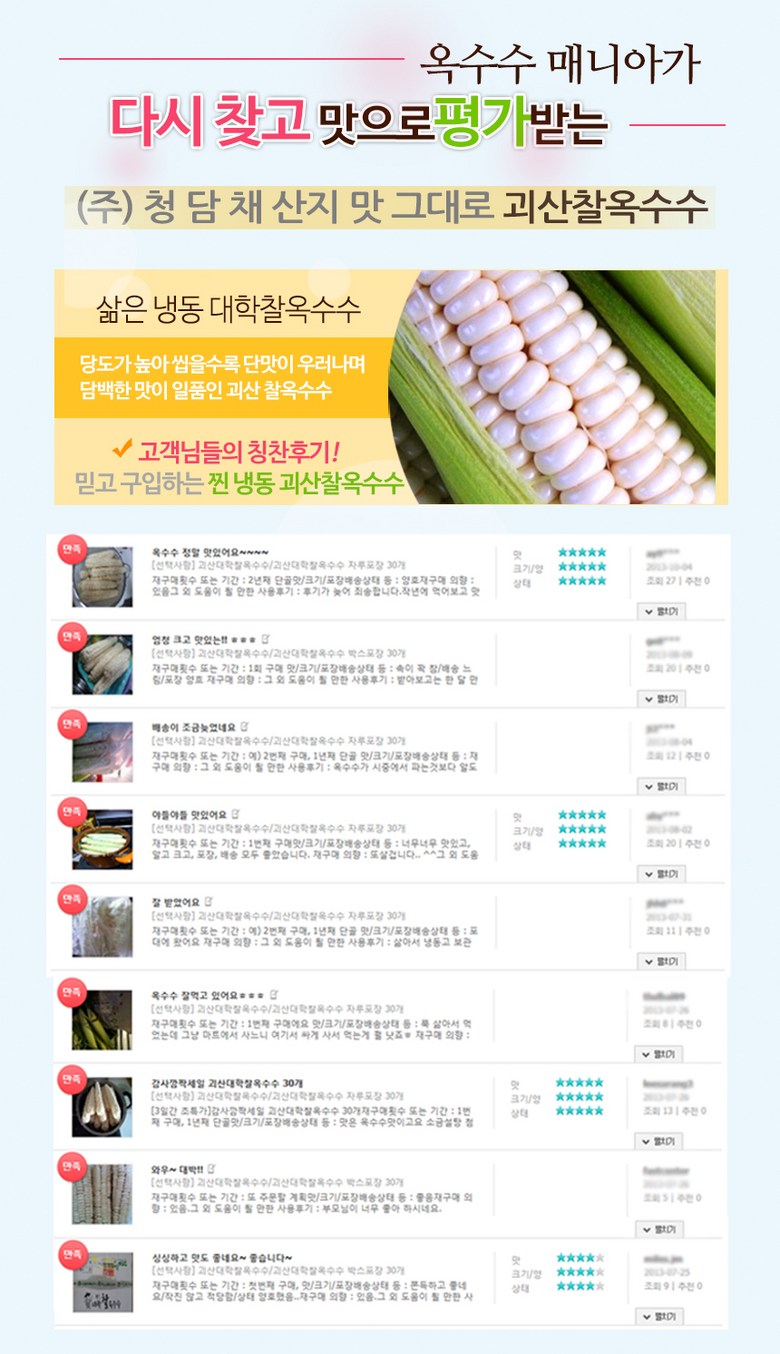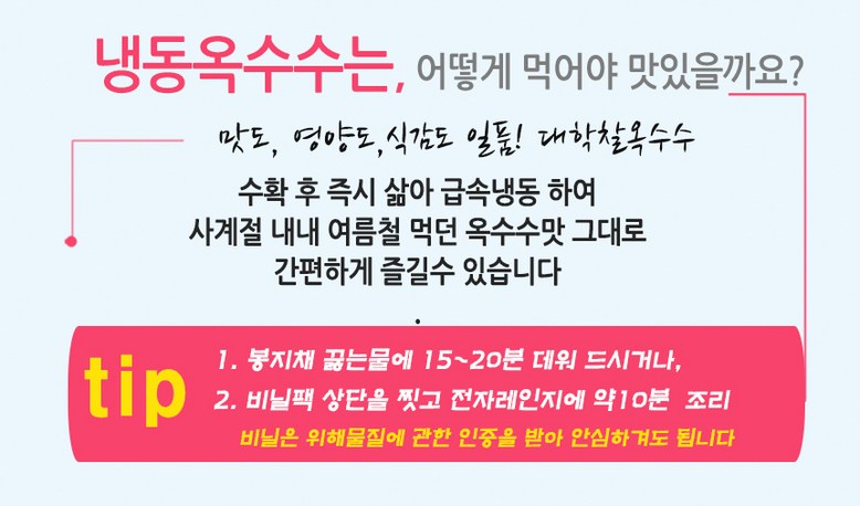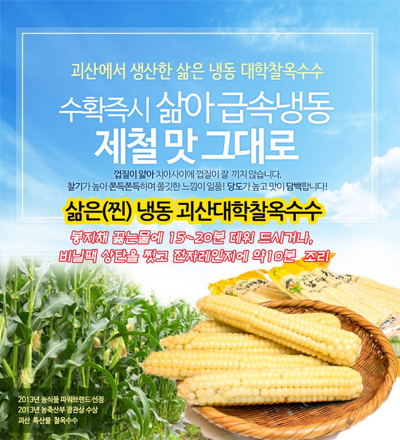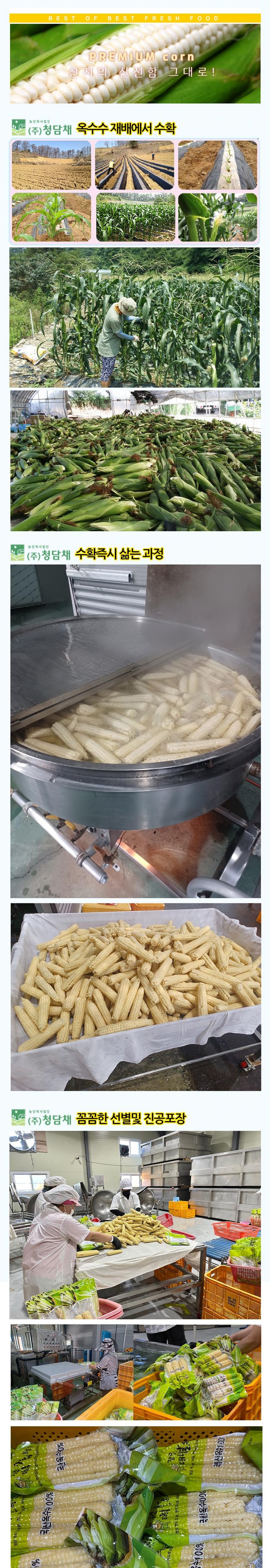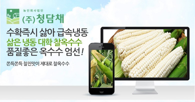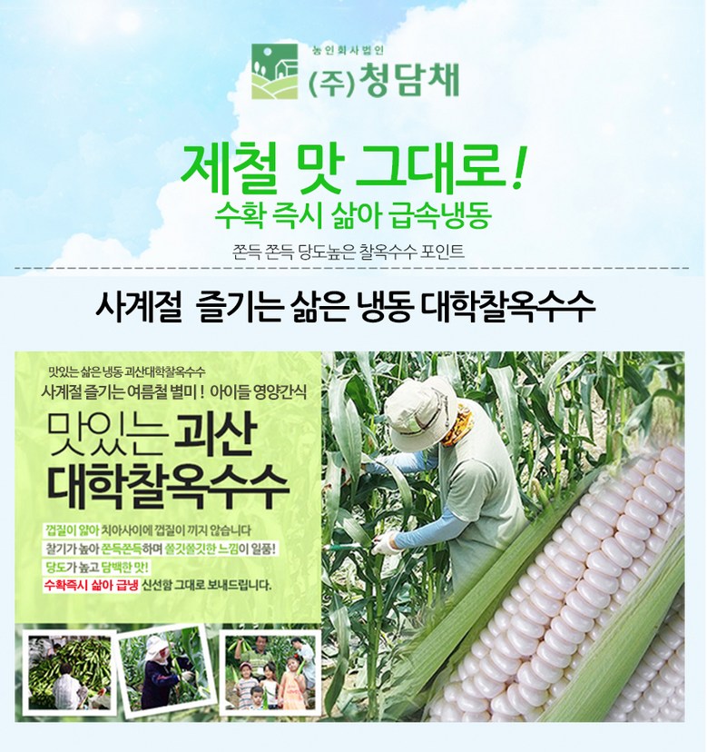 | 품목 또는 명칭 | 청담채 괴산 대학 찰옥수수 냉동 옥수수 찐 삶은 옥수수 진공포장 | 포장단위별 내용물의 용량(중량),수량,크기 | 15개,21개,30개 |