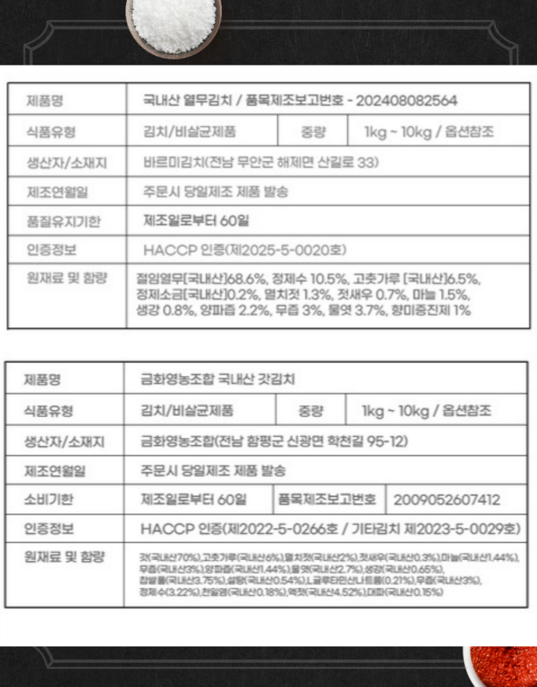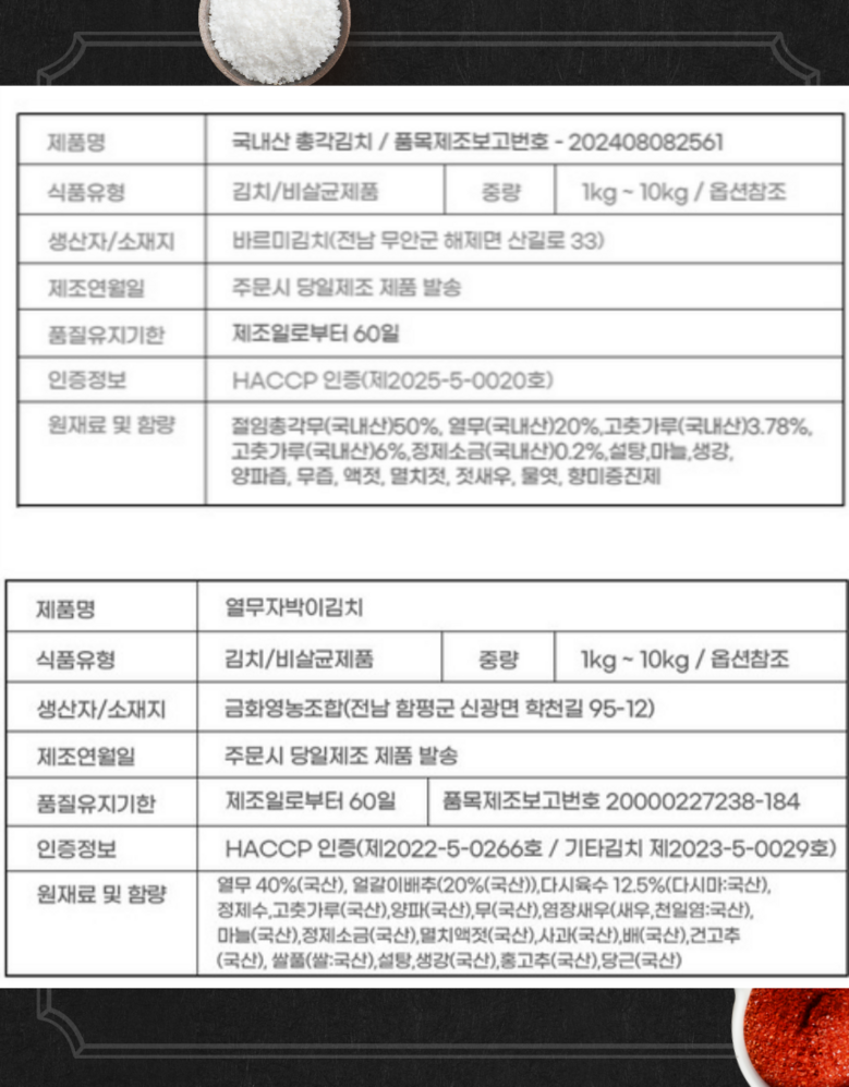 | 품목 또는 명칭 | 총각김치 | 포장단위별 내용물의 용량(중량),수량,크기 | 1박스 |