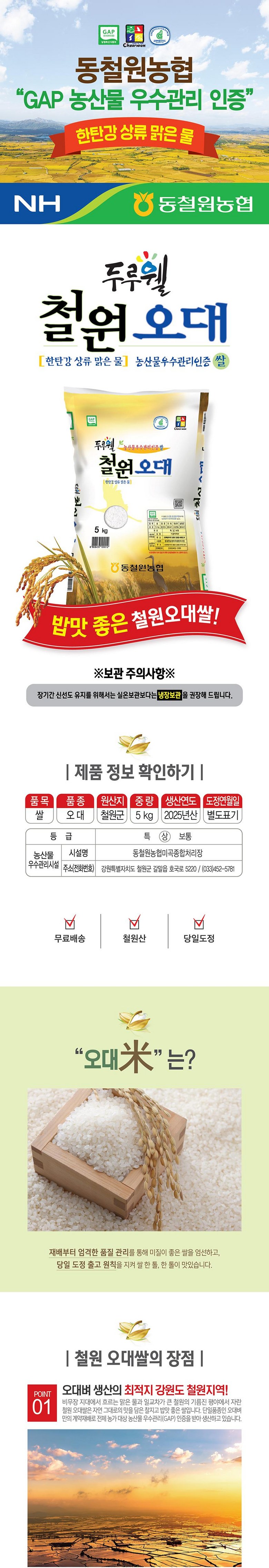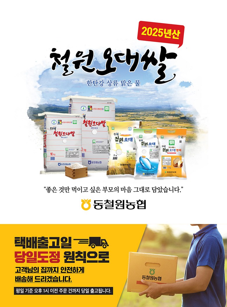 | 품목 또는 명칭 | 2025년산 동철원농협 철원오대 햅쌀 | 포장단위별 내용물의 용량(중량),수량,크기 | 20kg, 10kg x 2포, 10kg, 5kg, 4kg |