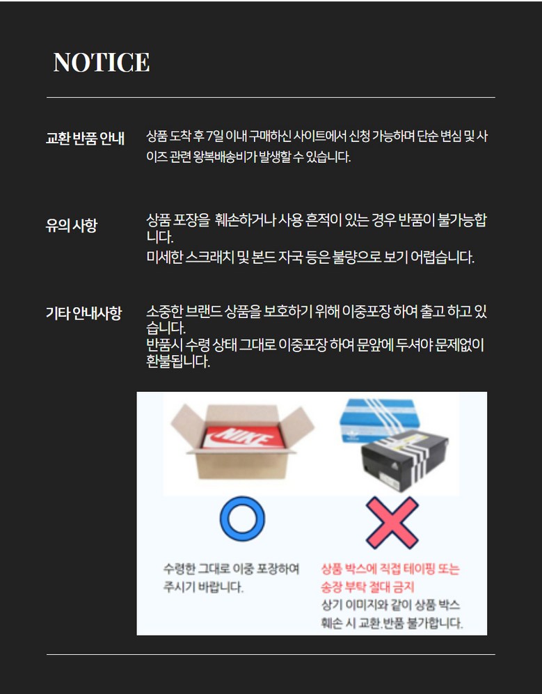 - ㆍ모니터 해상도의 차이로 인해 색상이나 이미지가 실제와 달라, 고객이 단순 변심으로 교환/반품을 무료로 요청하는 경우