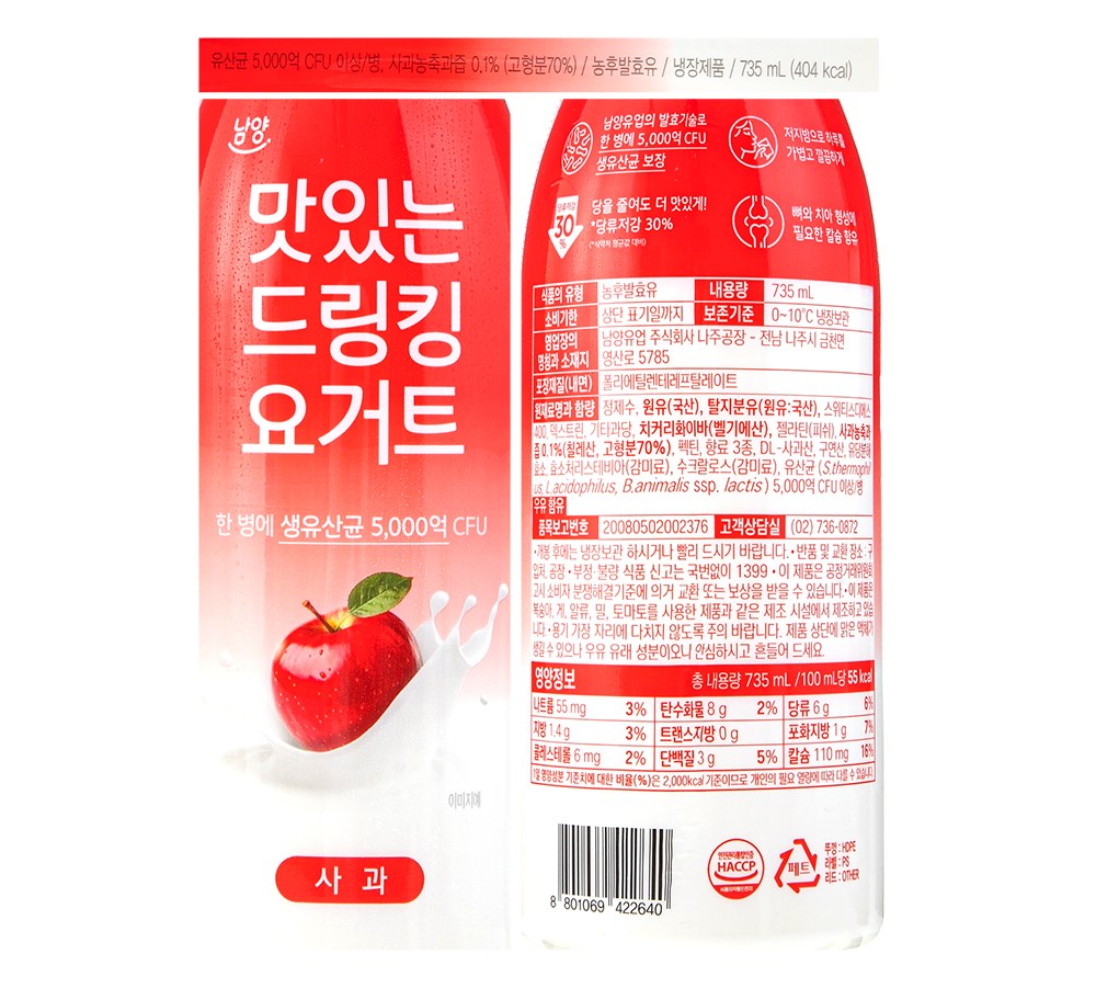 | 제품명 | 맛있는 드링킹 요거트 사과 | 식품의 유형 | 컨텐츠 참조 |