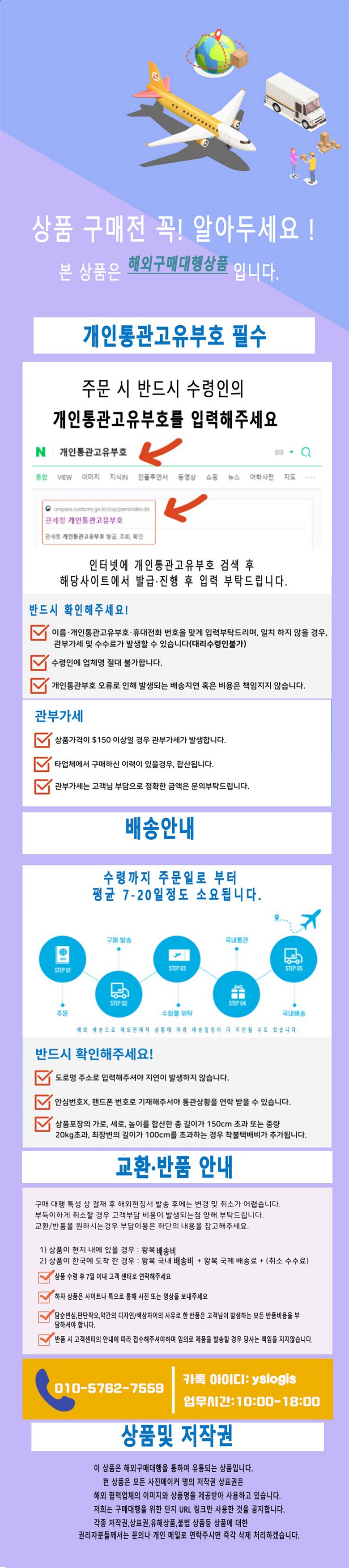 - 법규 개정에 따라 개인통관고유부호 검증 절차가 강화되었습니다. 결제 단계에서 받는 사람의 정보가 관세청 등록 정보 (성명, 휴대폰, 개인통관고유부호, 주소) 와 일치하는지 확인해주세요.