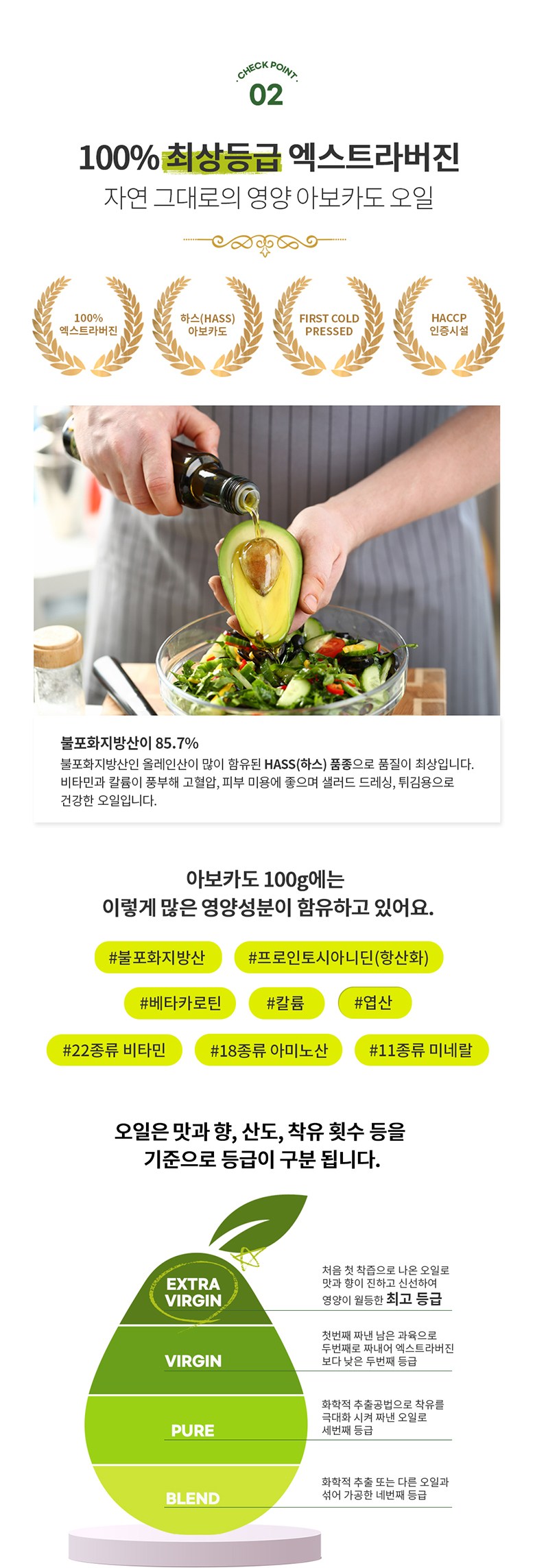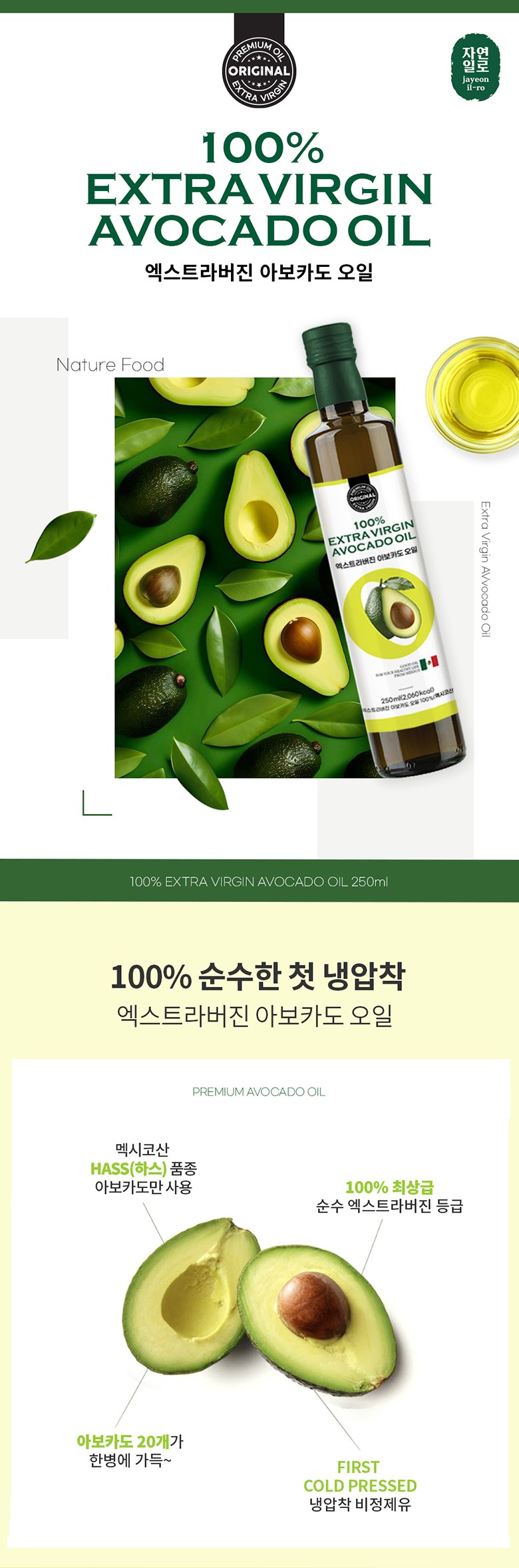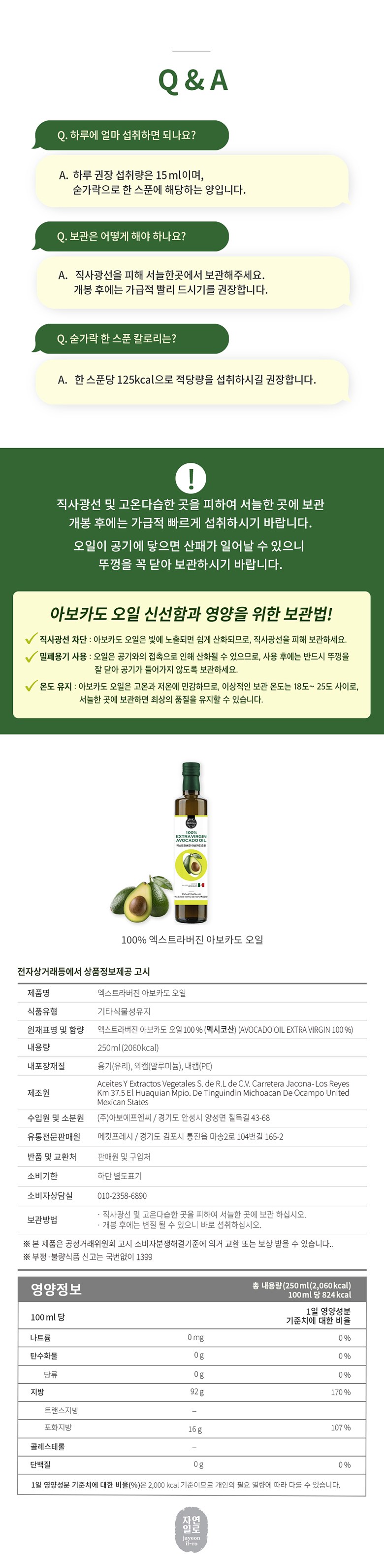 | 제품명 | 100% EXTRA VIRGIN AVOCADO OIL | 식품의 유형 | 상품 상세페이지 참조 |