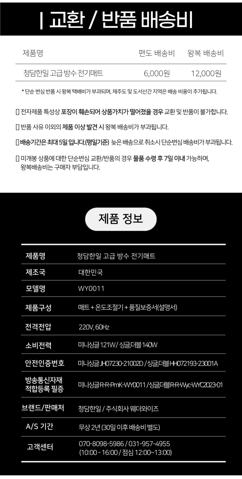 | 품명 및 모델명 | 청담한일 고급 방수 전기매트, WY0011 | KC 인증정보 | HH072193-23001A, R-R-PmK-WY0011 |