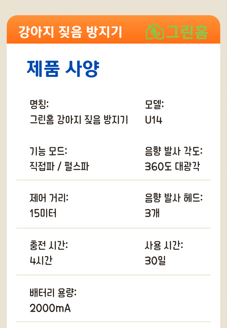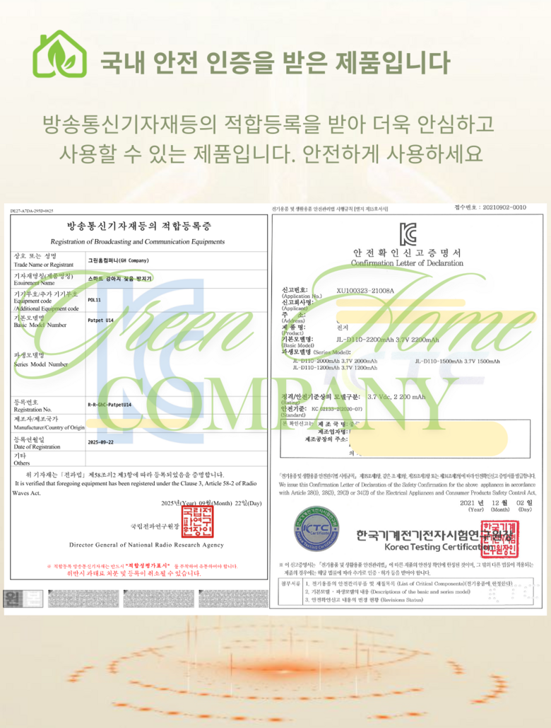 | 품명 및 모델명 | 그린홈 스마트 강아지 짖음 방지기 | 인증/허가 사항 | R-R-GhC-PatpetU14, 배터리 XU100323-21008A |
