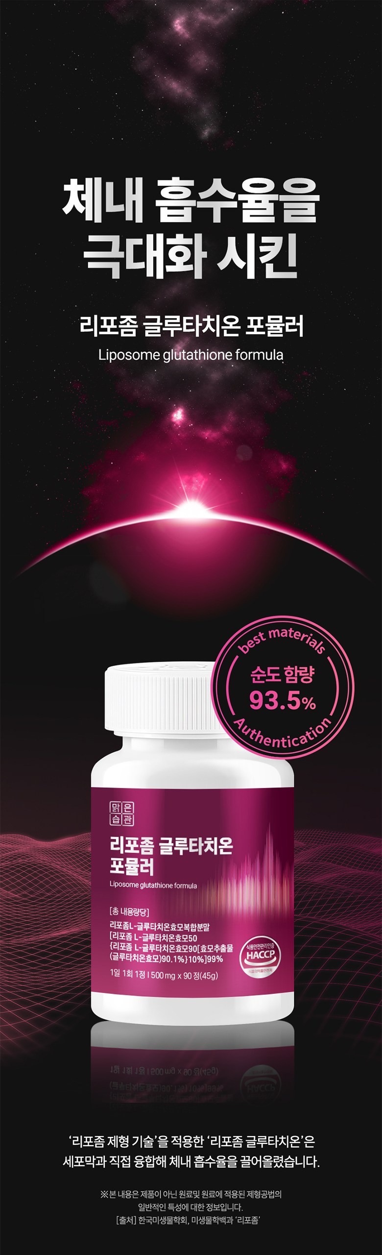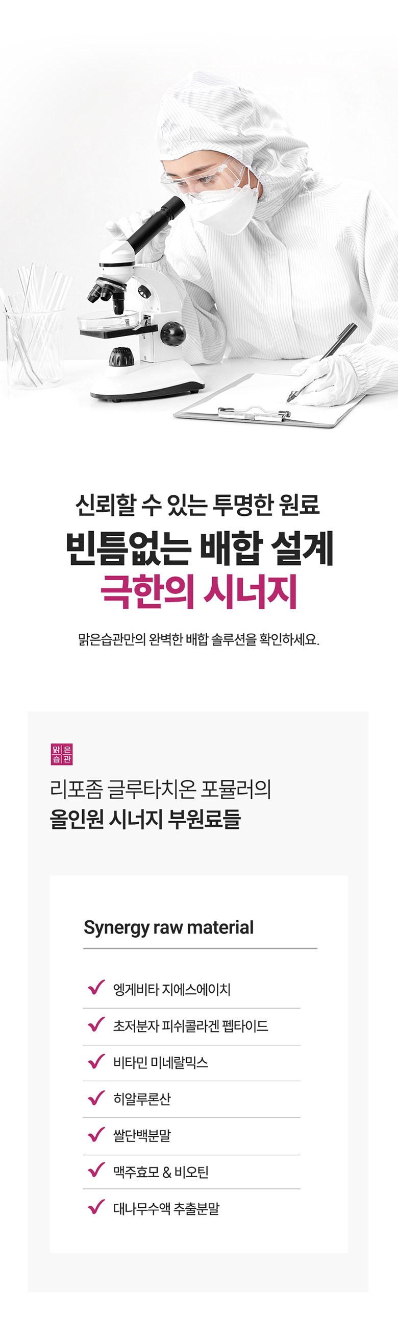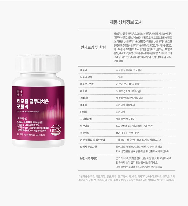 | 제품명 | 맑은습관 리포좀 글루타치온 포뮬러 | 제조업소의 명칭과 소재지 | 맑은습관 협력사 |