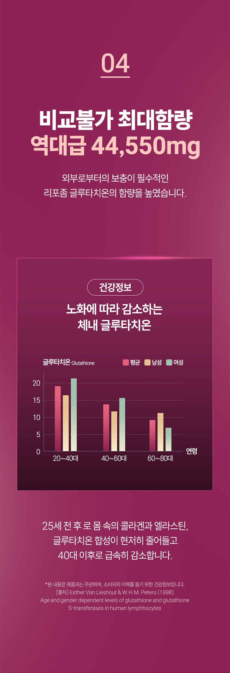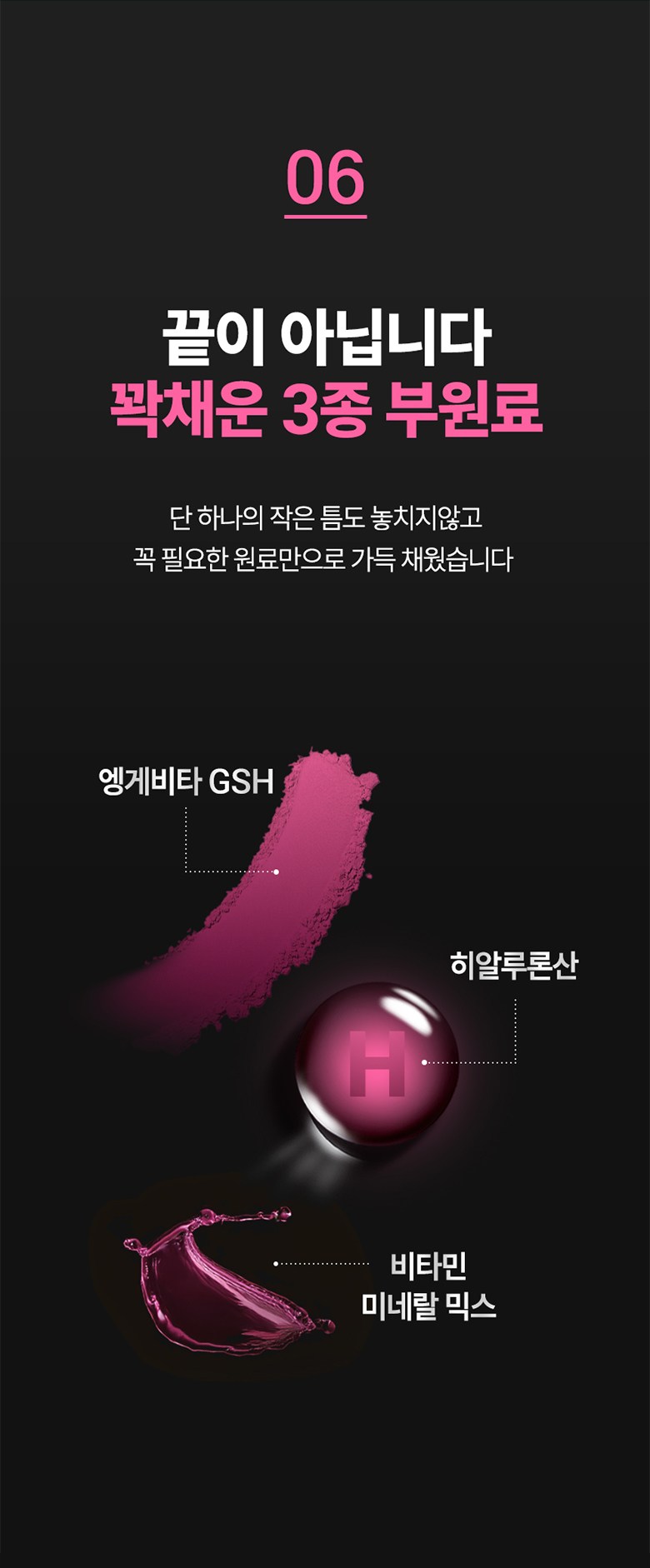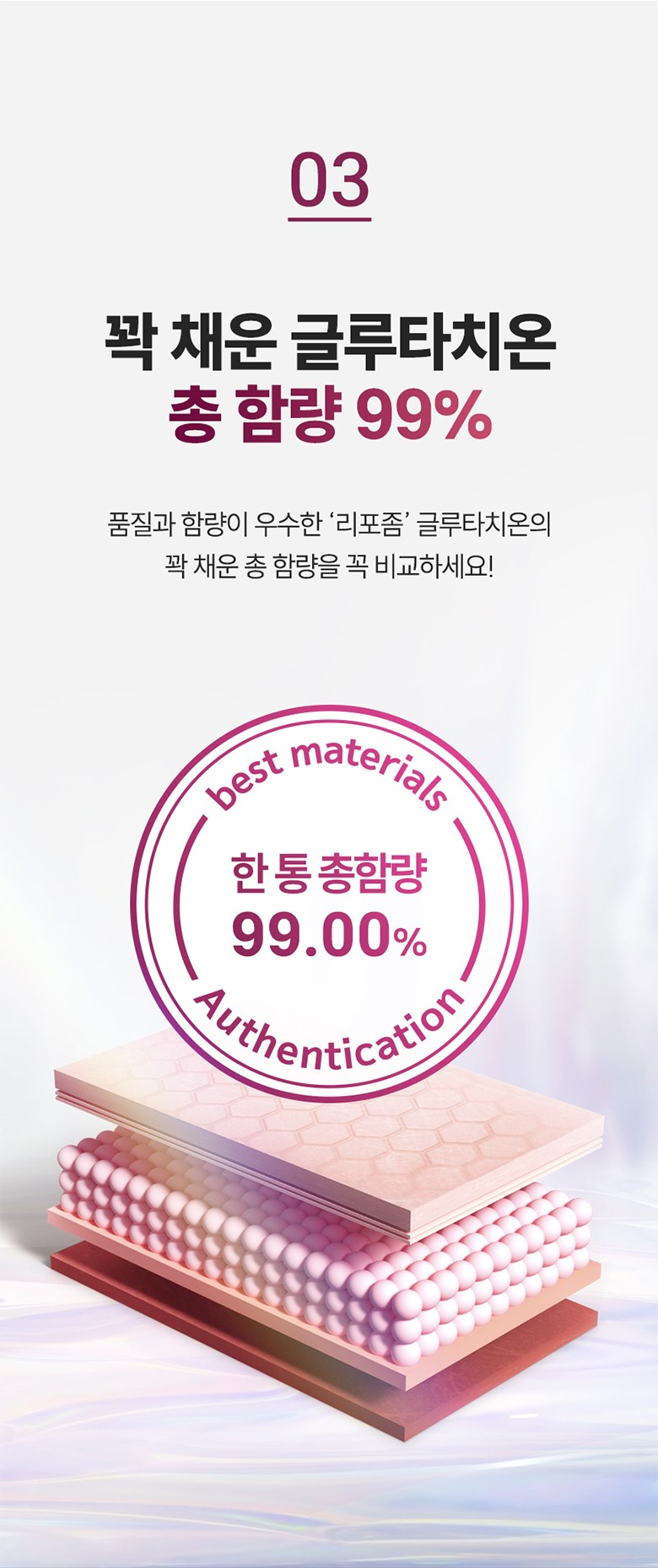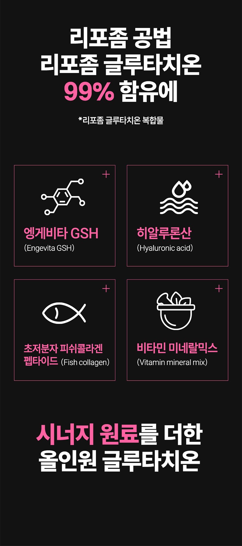 | 원료명 및 함량 | 리포좀L-글루타치온효모복합분말[엥게비타 지에스에이치(글루타치온2.5%/에스토니아산),정제포도당,결정셀룰로스,리포좀L-글루타치온효모50{리포좀L-글루타치온효모90{효모추출물(글루타치온효모/인도산),레시틴,구연산},덱스트린}],초저분자 피쉬콜라겐 펩타이드(인도산),히알루론산,맥주효모(독일산),대나무수액추출분말,스테아린산마그네슘,비오틴,남양비타민미네랄믹스,쌀단백분말 대두,우유 함유 | 영양정보 | 리포좀L-글루타치온효모복합분말[엥게비타 지에스에이치(글루타치온2.5%/에스토니아산),정제포도당,결정셀룰로스,리포좀L-글루타치온효모50{리포좀L-글루타치온효모90{효모추출물(글루타치온효모/인도산),레시틴,구연산},덱스트린}],초저분자 피쉬콜라겐 펩타이드(인도산),히알루론산,맥주효모(독일산),대나무수액추출분말,스테아린산마그네슘,비오틴,남양비타민미네랄믹스,쌀단백분말 대두,우유 함유 |
