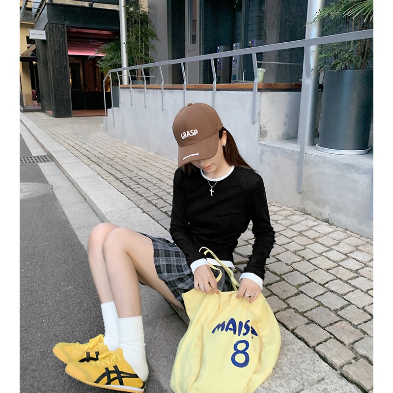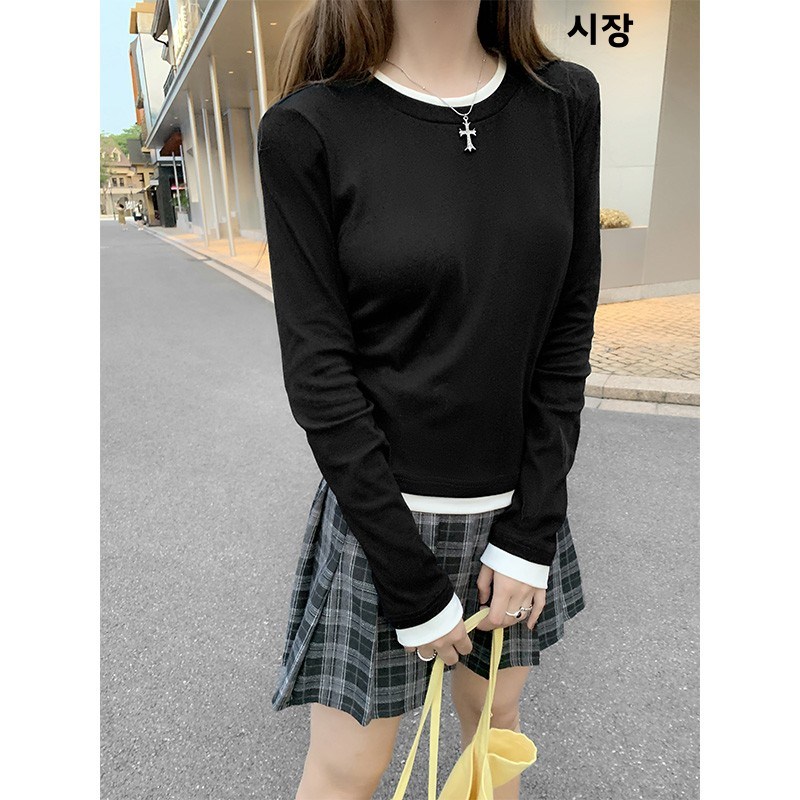 SHENGBIN 여성 봄가을 배색 레이어드 슬림핏 긴팔 티셔츠