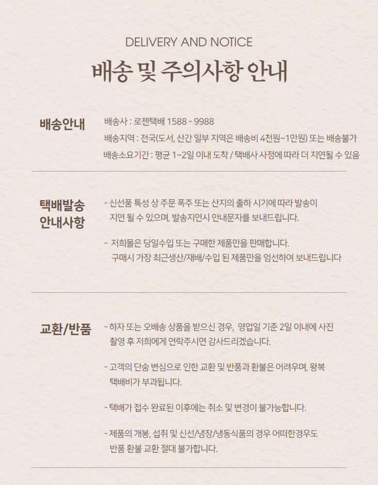 | 배송방법 | 신선/냉장/냉동 | 배송비 | 무료배송 · 도서산간 추가 배송비 - 제주 지역: 4,000원 - 도서산간 지역: 5,000원 |