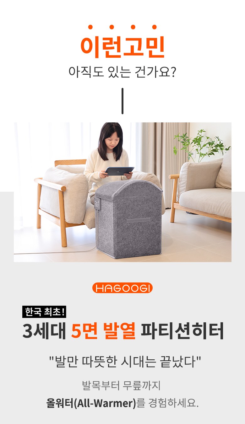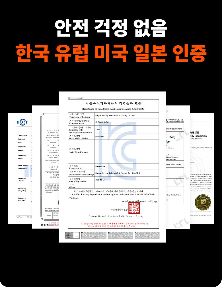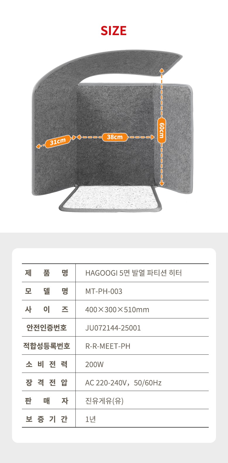 | 품명 및 모델명 | HAGOOGI 5면 발열 파티션 히터 사무실 발난로 책상밑난로 접이식히팅패드 | KC 인증정보 | 상품이 KC,EMC 대상인 경우, 본품 및 구성품 모두 인증번호 또는 인증번호가 없는 경우 KC 마크 여부를 기재해주세요. (대상이 아닌경우 "해당없음" 기재) |