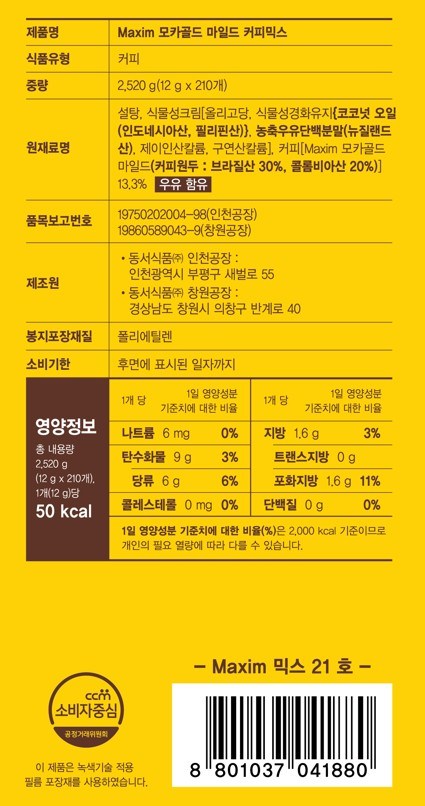 | 포장단위별 내용물의 용량(중량), 수량 | 2,520g x 1개 | 원재료명 및 함량 | 컨텐츠 참조 |