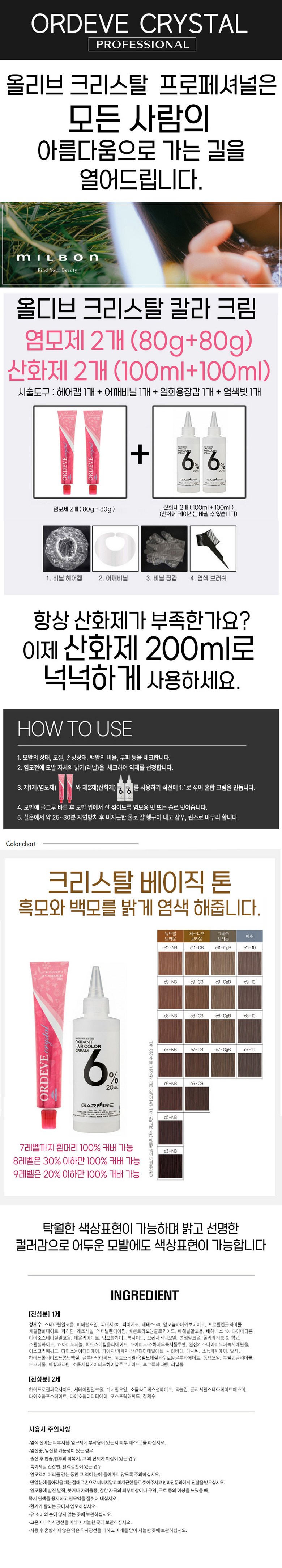 | 사용기한 또는 개봉 후 사용기간 | 유통기한까지 사용가능 | 사용방법 | 1제(염모제)와 2제(산화제)를 1:1 비율로 혼합후 모발에 고루 도포 |